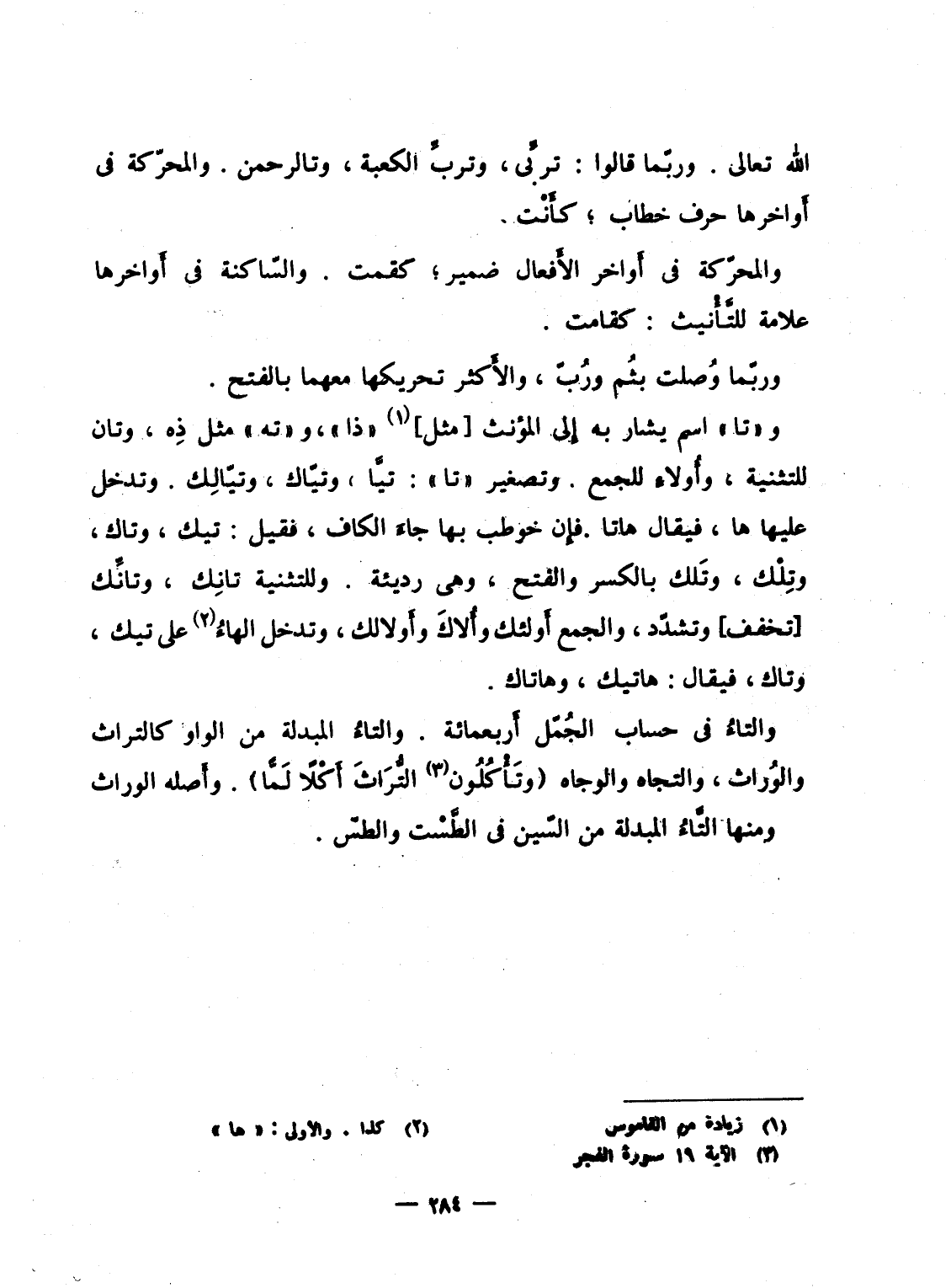 والتاءُ فى حساب الجُمّل أَربعمائة. والتاءُ المبدلة من الواو كالتراث والوُراث، والتجاه والوجاه {وَتَأْكُلُونَ التراث أَكْلاً لَّمّاً} . وأَصله الوراث ومنها التَّاءُ المبدلة من السّين فى الطَّسْت والطسّ.