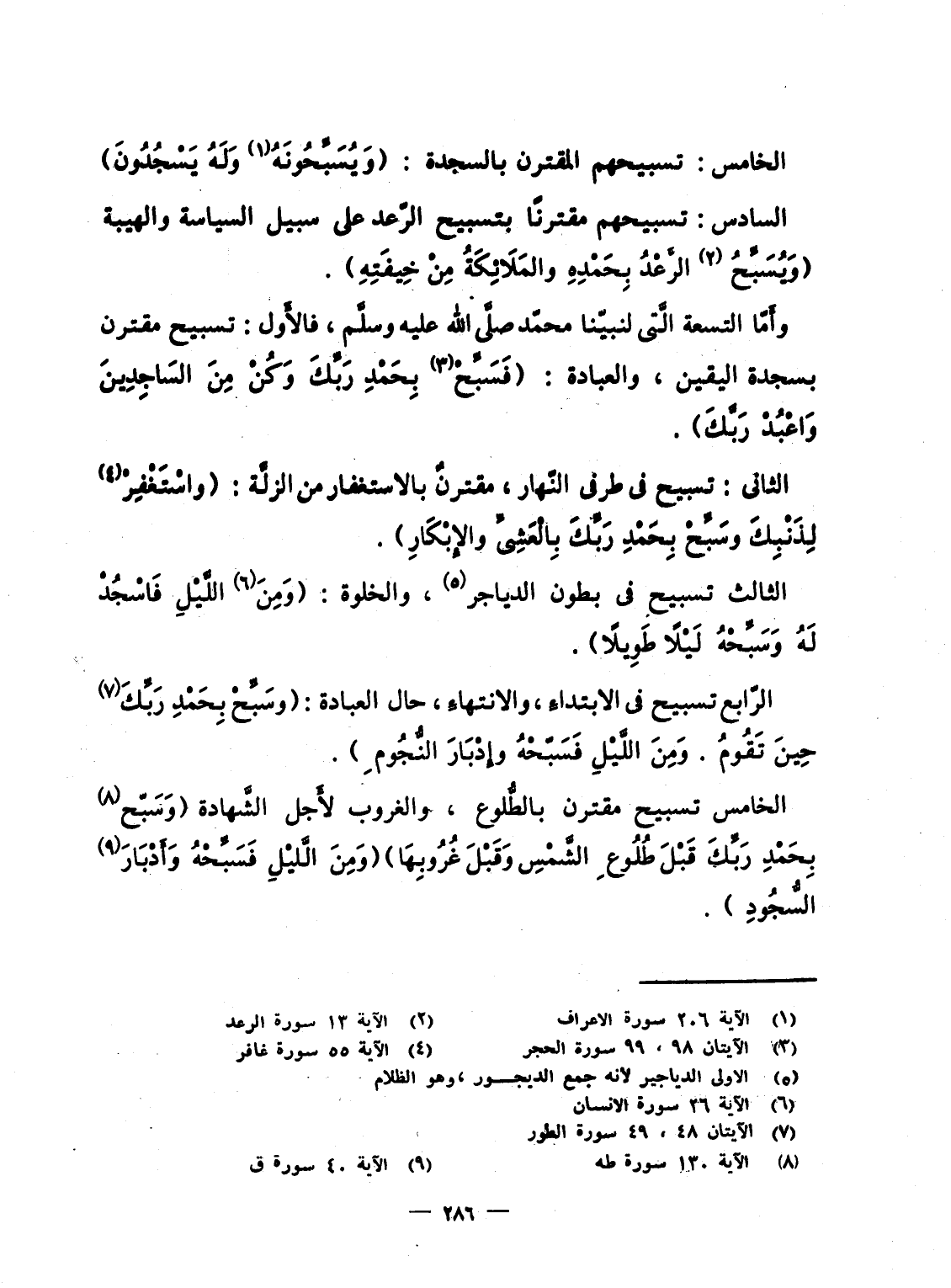 الخامس تسبيح مقترن بالطُّلوع، والغروب لأَجل الشَّهادة {وَسَبِّحْ بِحَمْدِ رَبِّكَ قَبْلَ طُلُوعِ الشمس وَقَبْلَ غُرُوبِهَا} {وَمِنَ الليل فَسَبِّحْهُ وَأَدْبَارَ السجود} .