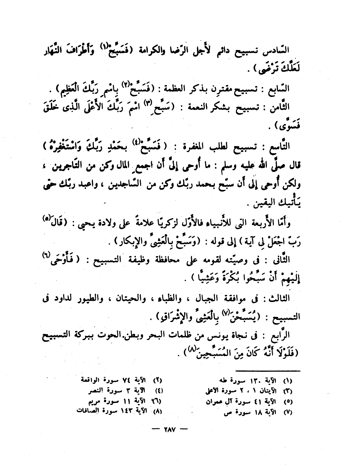السّادس تسبيح دائم لأَجل الرّضا والكرامة {فَسَبِّحْ وَأَطْرَافَ النهار لَعَلَّكَ ترضى} .