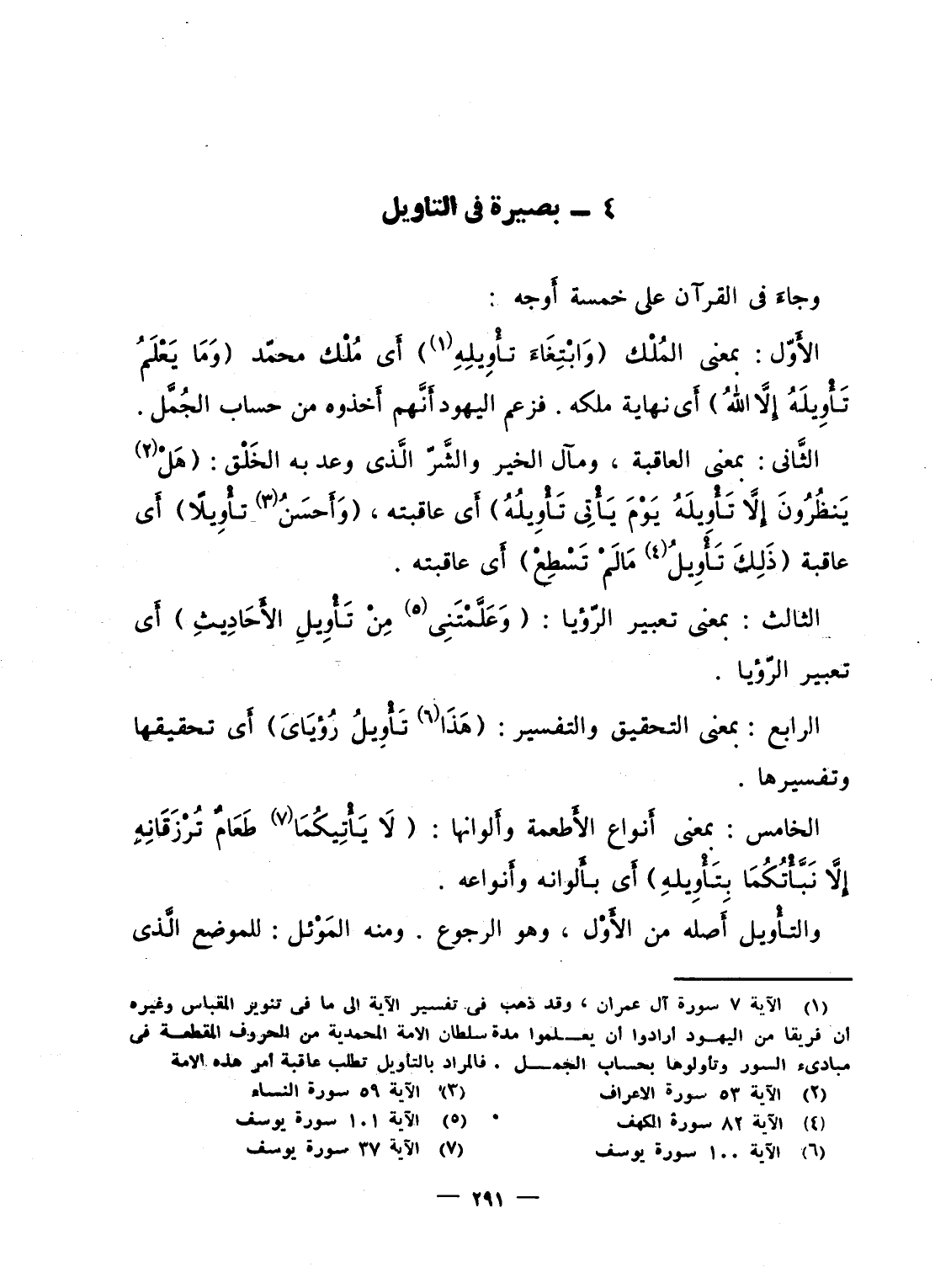 الأَوّل: بمعنى المُلْك {وابتغاء تَأْوِيلِهِ} أَى مُلْك محمّد {وَمَا يَعْلَمُ تَأْوِيلَهُ إِلاَّ اللهُ} أَى نهاية ملكه. فزعم اليهود أَنَّهم أَخذوه من حساب الجُمَّل.