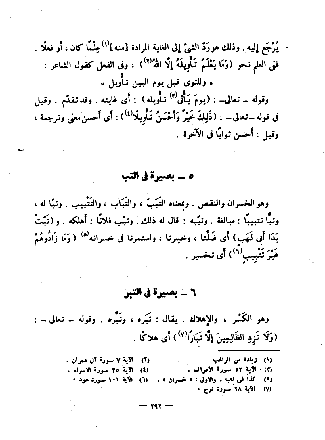 يُرْجَعِ إِليه. وذلك هو رَدّ الشئ إِلى الغاية المرادة [منه] عِلْماً كان، أَو فعلاً. ففى العلم نحو {وَمَا يَعْلَمُ تَأْوِيلَهُ إِلاَّ الله} ، وفى الفعل كقول الشاعر:
