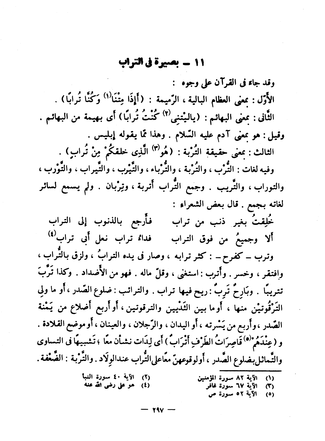 الثَّانى: بمعنى البهائم: {ياليتني كُنتُ تُرَاباً} أَى بهيمة من البهائم. وقيل: هو بمعنى آدم عليه السّلام. وهذا ممّا يقوله إِبليس.