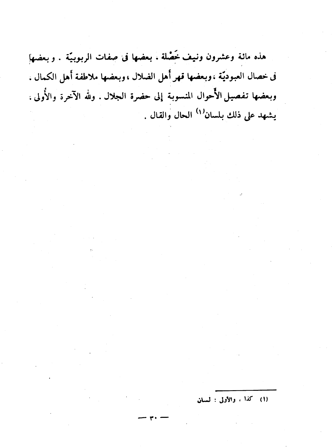 هذه مائة وعشرون ونيف خَصْلة، بعضها فى صفات الربوبيّة، وبعضها فى خصال العبوديّة، وبعضها قهر أَهل الضلال، وبعضها ملاطفة أَهل الكمال، وبعضها تفصيل الأَحوال المنسوبة إِلى حضرة الجلال، ولله الآخرة والأُولى، يشهد على ذلك بلسان الحال والقال.