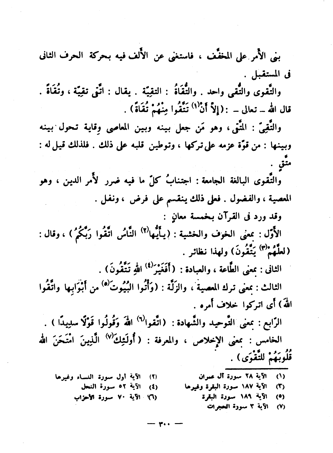 الأَوّل: بمعنى الخوف والخشية: {ياأيها الناس اتقوا رَبَّكُمُ} ، وقال: {لَعَلَّهُمْ يَتَّقُونَ} ولهذا نظائر.