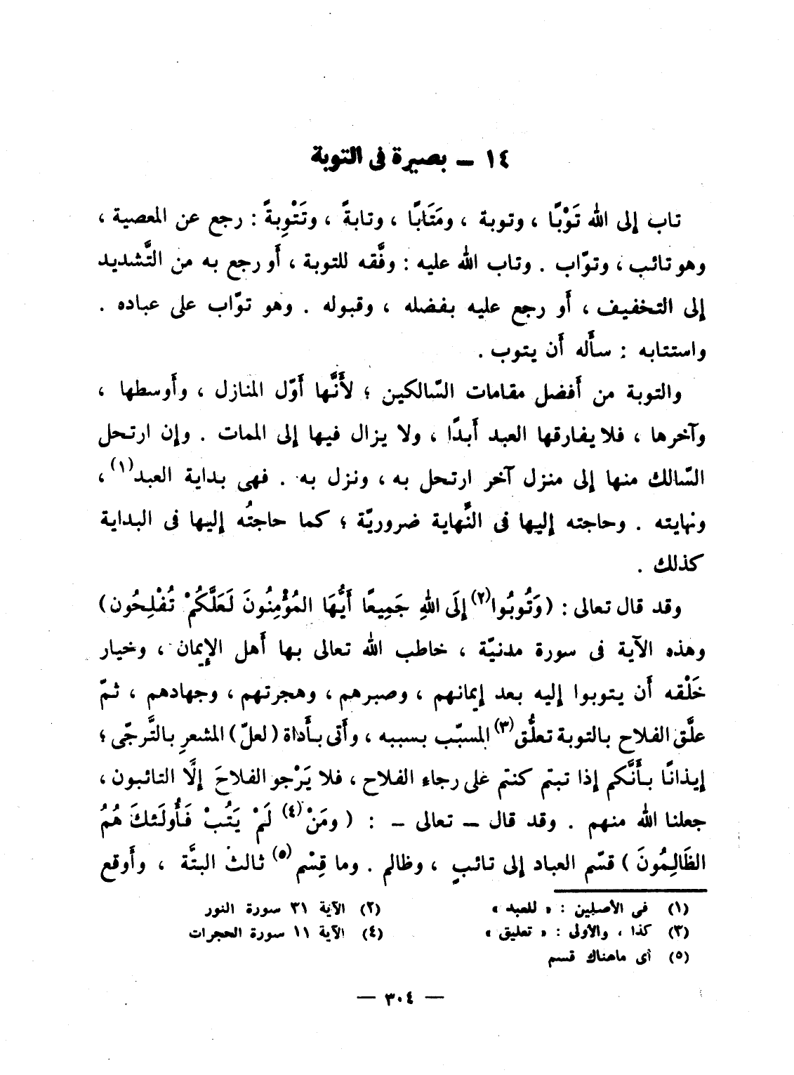 وقد قال تعالى: {وتوبوا إِلَى الله جَمِيعاً أَيُّهَ المؤمنون لَعَلَّكُمْ تُفْلِحُونَ} وهذه الآية فى سورة مدنيّة، خاطب الله تعالى بها أهل الإِيمان، وخيار خَلْقه أَن يتوبوا إِليه بعد إِيمانهم، وصبرهم، وهجرتهم، وجهادهم، ثمّ علَّق الفلاح بالتوبة تعلُّق المسبّب بسببه، وأَتى بأَداة (لعلّ) المشعرِ بالتَّرجّى؛ إِيذاناً بأَنَّكم إِذا تبتم كنتم على رجاءِ الفلاح، فلا يَرْجوا الفلاحَ إِلاَّ التائبون، جعلنا الله منهم. وقد قال - تعالى -: {وَمَن لَّمْ يَتُبْ فأولائك هُمُ الظالمون} قسّم العباد إِلى تائبٍ، وظالم. وما قِسْم ثالث البتَّة، وأَوقع