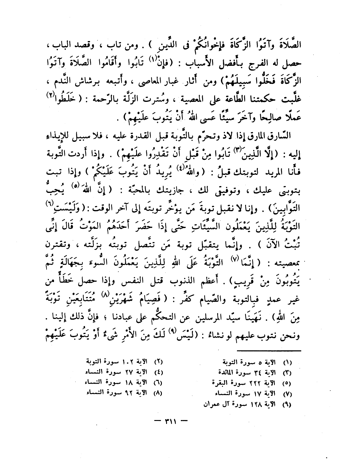 السّارق المارق إِذا لاذ وتحرّم بالتَّوبة قبل القدرة عليه، فلا سبيل للإِيذاءِ إِليه: {إِلاَّ الذين تَابُواْ مِن قَبْلِ أَن تَقْدِرُواْ عَلَيْهِمْ} . وإِذا أَردت التَّوبة فأَنا المريد لتوبتك قبلُ: {والله يُرِيدُ أَن يَتُوبَ عَلَيْكُمْ} وإِذا تبت بتوبتى عليك، وتوفيقى لك، جازيت بالمحبّة: {إِنَّ الله يُحِبُّ التوابين} . وإِنا لا نقبل توبةَ مَن يؤخِّر توبتَه إِلى آخر الوقت: {وَلَيْسَتِ التوبة لِلَّذِينَ يَعْمَلُونَ السيئات حتى إِذَا حَضَرَ أَحَدَهُمُ الموت قَالَ إِنِّي تُبْتُ الآن} . وإِنَّما يتقبّل توبة مَن تتَّصل توبتُه بزَلَّته، وتقترن بمعصيته: {إِنَّمَا التوبة عَلَى الله لِلَّذِينَ يَعْمَلُونَ السواء بِجَهَالَةٍ ثُمَّ يَتُوبُونَ مِن قَرِيبٍ} . أَعظم الذنوب قتل النفس وإِذا حصل خَطَأً من غير عمدٍ فبِالتوبة والصّيام كفِّر: {فَصِيَامُ شَهْرَيْنِ مُتَتَابِعَيْنِ تَوْبَةً مِّنَ الله} . نَهَينَا سيّد المرسلين عن التحكُّم على عبادنا؛ فإِنَّ ذلك إِلينا. ونحن نتوب عليهم لو نشاءُ: {لَيْسَ لَكَ مِنَ الأمر شَيْءٌ أَوْ يَتُوبَ عَلَيْهِمْ