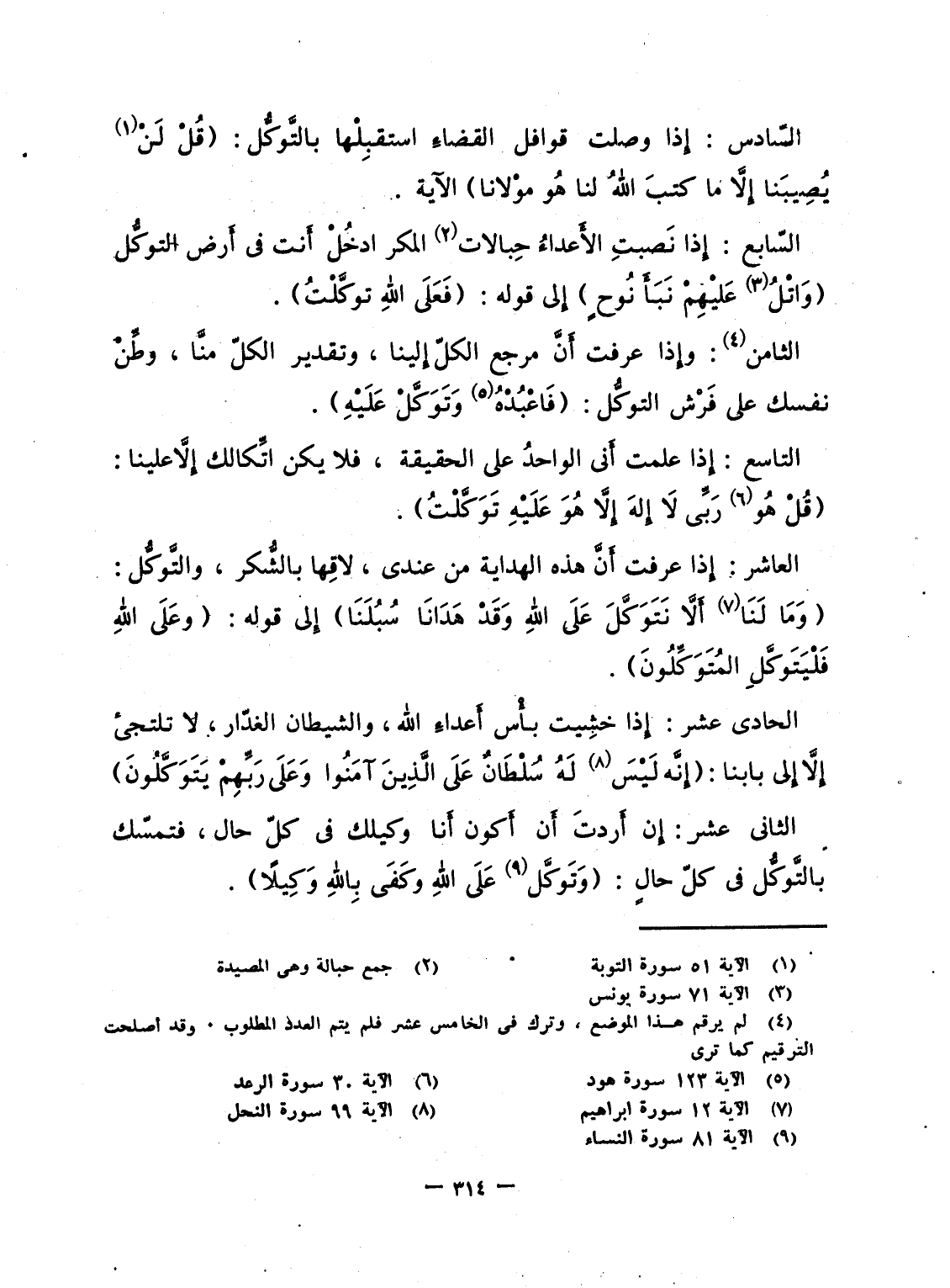 التاسع: إِذا علمت أَنى الواحدُ على الحقيقة، فلا يكن اتِّكالك إِلاَّ علينا: {قُلْ هُوَ رَبِّي لا إلاه إِلاَّ هُوَ عَلَيْهِ تَوَكَّلْتُ} .