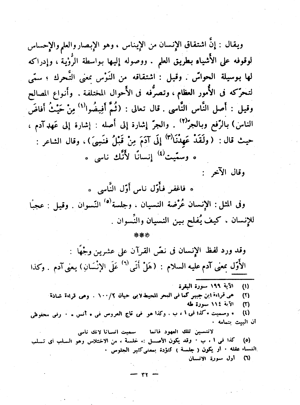 ويقال: إِنَّ اشتقاق الإِنسان من الإِيناس. وهو الإِبصار والعلم والإِحساس لوقوفه على الأَشياءِ بطريق العلم، ووصوله إِليها بواسطة الرُّؤية، وإِدراكه لها بوسيلة الحواسّ. وقيل: اشتقاقه من النَوْس بمعنى التَّحرك؛ سمّى لتحرّكه فى الأُمور العظام، وتصرُّفه فى الأَحوال المختلفة، وأَنواع المصالح وقيل: أَصل النَّاس النَّاسى. قال تعالى: {ثُمَّ أَفِيضُواْ مِنْ حَيْثُ أَفَاضَ الناس} بالرّفع وبالجرّ. والجرّ إشارة إِلى أَصله: إِشارة إلى عَهد آدم، حيث قال: {وَلَقَدْ عَهِدْنَآ إلىءَادَمَ مِن قَبْلُ فَنَسِيَ} ، وقال الشاعر: