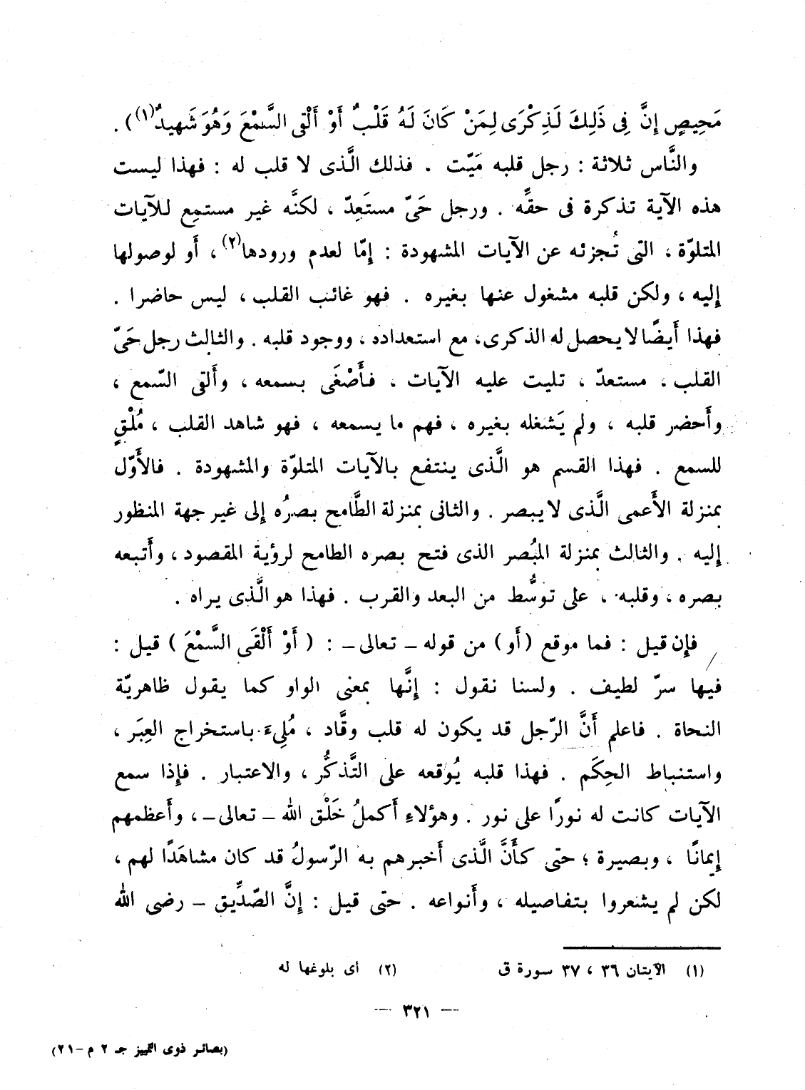 والنَّاس ثلاثة: رجل قلبه مَيّت، فذلك الَّذى لا قلب له: فهذا ليست هذه الآية تذكرة فى حقِّه. ورجل حَىّ مستَعِدّ، لكنَّه غير مستمِع للآيات المتلوّة، التى تُجزئه عن الآيات المشهودة: إِمّا لعدم ورودها، أَو لوصولها إِليه، ولكن قلبه مشغول عنها بغيره. فهو غائب القلب، ليس حاضرا. فهذا أَيضاً لا يحصل له الذكرى، مع استعداده، ووجود قلبه. والثالث رجل حَىّ القلب، مستعدّ، تليت عليه الآيات، فأَصْغَى بسمعه، وأَلقى السّمع، وأَحضر قلبه، ولم يَشغله بغيره، فهم ما يسمعه، فهو شاهد القلب، مُلْقٍ للسمع. فهذا القسم هو الَّّذى ينتفع بالآيات المتلوّة والمشهودة. فالأَوّل بمنزلة الأَعمى الَّذى لا يبصر. والثانى بمنزلة الطَّامح بصرُه إِلى غير جهة المنظور إِليه. والثالث بمنزلة المبُصر الذى فتح بصره الطامح لرؤية المقصود، وأَتبعه بصره، وقلبه، على توسُّط من البعد والقرب. فهذا هو الَّذى يراه.
