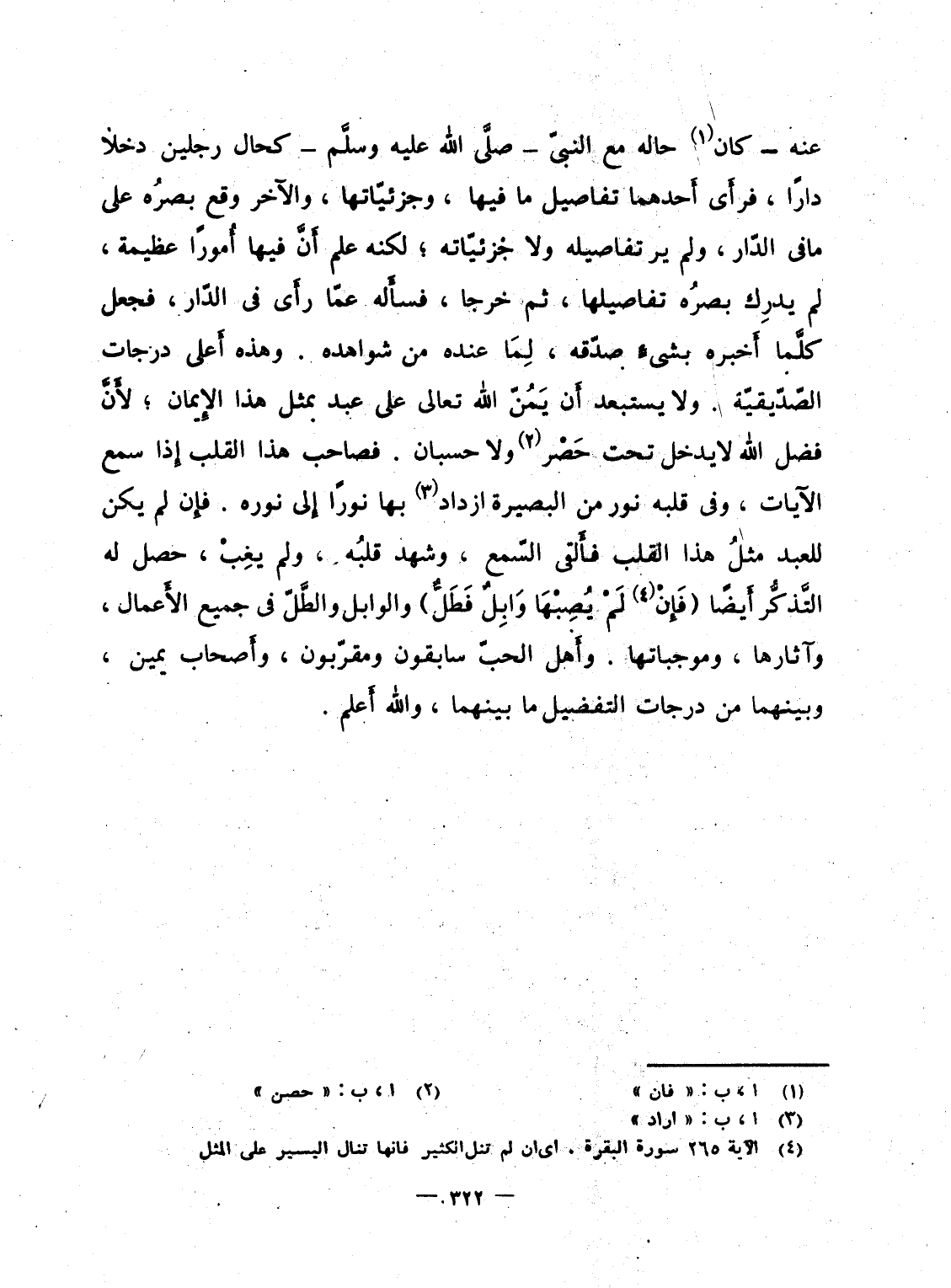 عنه - كان حاله مع النبىّ - صلَّى الله عليه وسلَّم - كحال رجلين دخلا داراً. فرأَى أَحدهما تفاصيل ما فيها، وجزئيّاتها، والآخر وقع بصرُه على ما فى الدّار، ولم ير تفاصيله ولا جزئيّاته؛ لكنه علم أَنَّ فيها أُموراً عظيمة، لم يدرِك بصرُه تفاصيلها، ثم خرجا، فسأَله عمّا رأَى فى الدّار، فجعل كلَّما أَخبره بشئٍ صدّقه، لِمَا عنده من شواهده. وهذه أَعلى درجات الصّدّيقيّة. ولا يستبعد أَن يَمُنّ الله تعالى على عبد بمثل هذا الإِيمان؛ لأَنَّ فضل الله لا يدخل تحت حَصْر ولا حسبان. فصاحب هذا القلب إِذا سمع الآيات. وفى قلبه نور من البصيرة ازداد بها نوراً إِلى نوره. فإِن لم يكن للعبد مثلُ هذا القلب فأَلقى السّمع، وشهد قلبُه، ولم يغِبْ، حصل له التَّذكُّر أَيضاً {فَإِن لَّمْ يُصِبْهَا وَابِلٌ فَطَلٌّ} والوابل والطَّلّ فى جميع الأَعمال، وآثارها، وموجباتها. وأَهل الحبّ سابقون ومقرّبون، وأَصحاب يمين، وبينهما من درجات التفضيل ما بينهما، والله أَعلم.