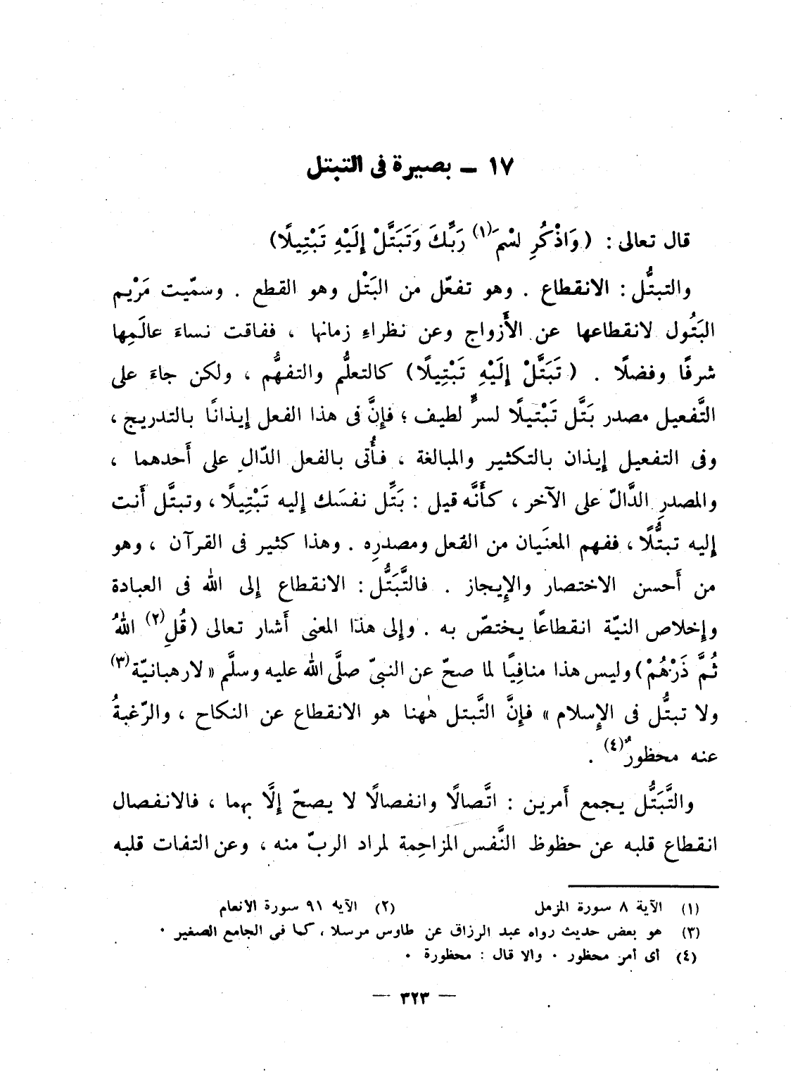 والتبتُّل: الانقطاع. وهو تفعّل من البَتْل وهو القطع. وسمّيت مَرْيم البَتُول لانقطاعها عن الأَزواج وعن نظراءِ زمانها، ففاقت نساءَ عالَمِها شرفاً وفضلاً. {وَتَبَتَّلْ إِلَيْهِ تَبْتِيلاً} كالتعلُّم والتفهُّم. ولكن جاءَ على التَّفعيل مصدر بَتَّل تَبْتيلاً لسرٍّ لطيف؛ فإِنَّ فى هذا الفعل إِيذاناً بالتدريج، وفى التفعيل إِيذان بالتكثير والمبالغة، فأُتى بالفعل الدّال على أَحدهما، والمصدر الدَّالّ على الآخر، كأَنَّه قيل: بَتِّل نفسَك إِليه تَبْتِيلاً، وتبتَّل أَنت إِليه تبتُّلاً، ففهم المعنَيان من الفعل ومصدرِه. وهذا كثير فى القرآن، وهو من أَحسن الاختصار والإِيجاز. فالتَّبَتُّل: الانقطاع إِلى الله فى العبادة وإِخلاص النيّة انقطاعاً يختصّ به. وإِلى هذا المعنى أَشار تعالى {قُلِ الله ثُمَّ ذَرْهُمْ} وليس هذا منافِياً لما صحّ عن النبىّ صلَّى الله عليه وسلَّم "لا رهبانيّة ولا تبتُّل فى الإِسلام" فإِنَّ التَّبتل هاهنا هو الانقطاع من النكاح، والرّغبةُ عنه محظورٌ.
