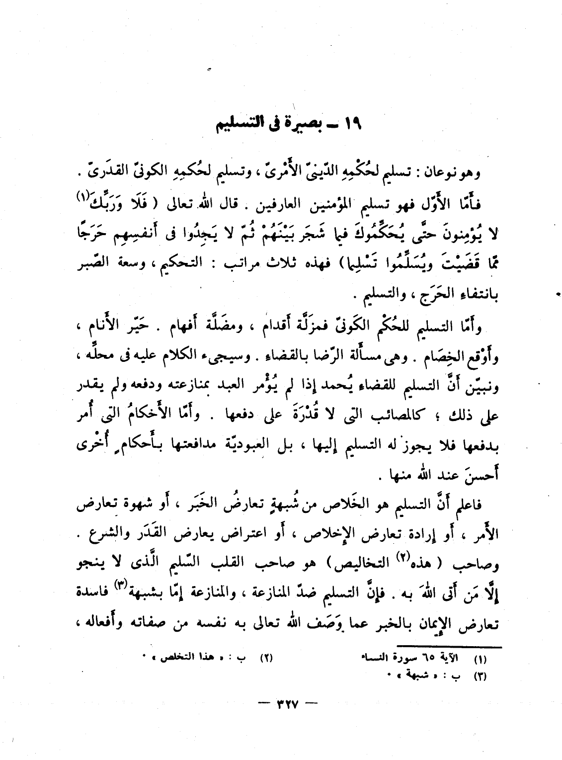 فأَمّا الأَوّل فهو تسليم المؤمنين العارفين. قال الله تعالى {فَلاَ وَرَبِّكَ لاَ يُؤْمِنُونَ حتى يُحَكِّمُوكَ فِيمَا شَجَرَ بَيْنَهُمْ ثُمَّ لاَ يَجِدُواْ في أَنْفُسِهِمْ حَرَجاً مِّمَّا قَضَيْتَ وَيُسَلِّمُواْ تَسْلِيماً} فهذه ثلاث مراتب: التحكيم، وسعة الصّبر بانتفاءِ الحَرَج، والتسليم.