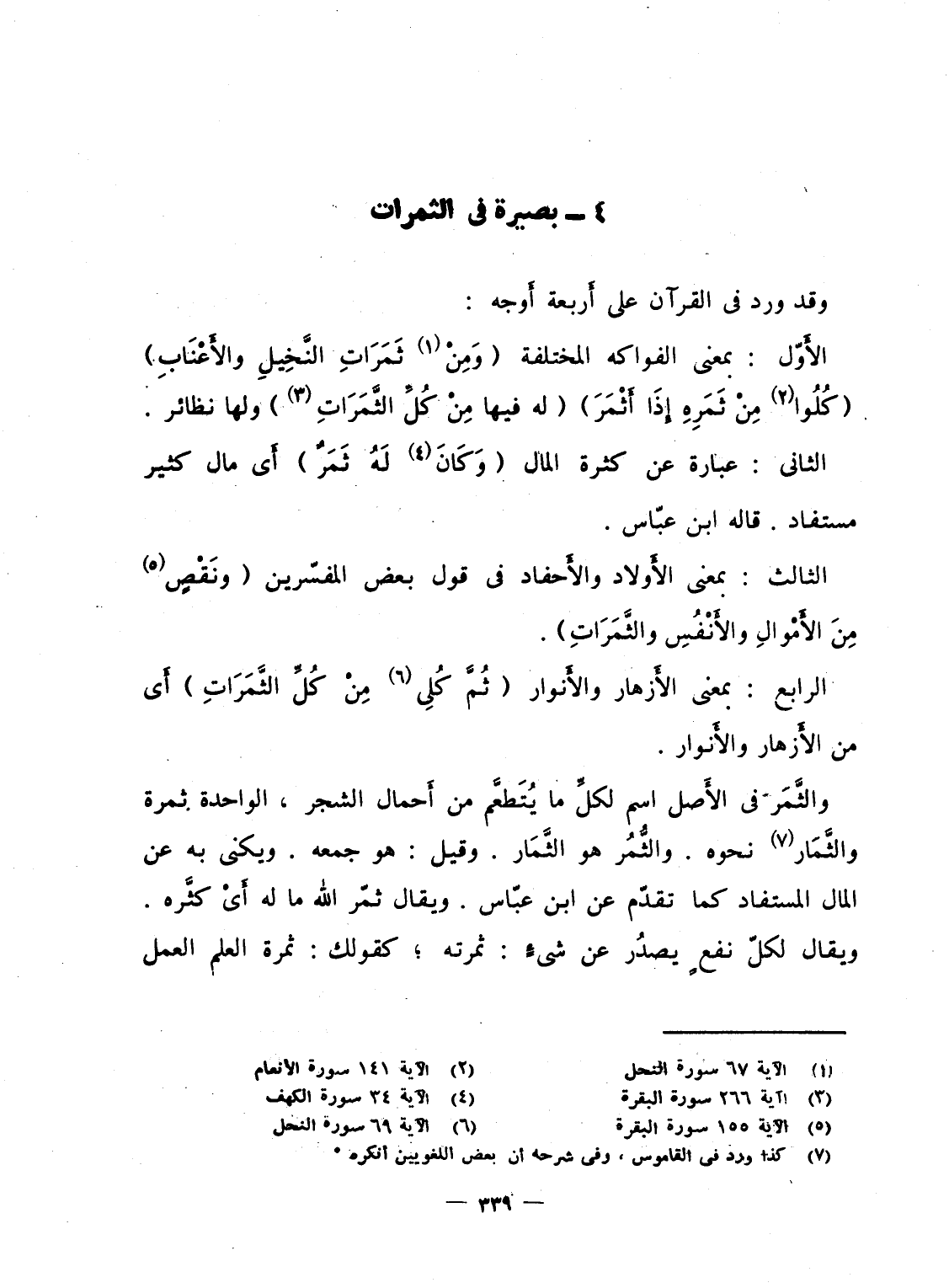 الأَوّل: بمعنى الفواكه المختلفة {وَمِن ثَمَرَاتِ النخيل والأعناب} {كُلُواْ مِن ثَمَرِهِ إِذَآ أَثْمَرَ} {لَهُ فِيهَا مِن كُلِّ الثمرات} ولها نظائر.