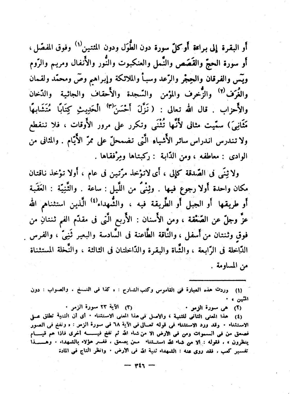 أَو البقرة إِلى براءَة أَو كلّ سورة دون الطُّوَل ودون المئتين وفوق المفصّل، أَو سورة الحجّ والقَصَص والنَّمل والعنكبوت والنُّور والأَنفال ومريم والرّوم ويس والفرقان والحِجْر والرّعد وسبأ والملائكة وإِبراهيم وص ومحمّد ولقمان والغُرَف والزُّخرف والمؤمن والسّجدة والأَحقاف والجاثية والدّخان والأَحزاب. قال الله تعالى: {نَزَّلَ أَحْسَنَ الحديث كِتَاباً مُّتَشَابِهاً مَّثَانِيَ} سمّيت مثانى لأَنَّها تُثْنَى وتكرر على مرور الأَوقات، فلا تنقطع ولا تندرس اندراس سائر الأَشياءِ الَّتى تضمحلّ على ممرّ الأَيّام. المثانى من الوادى: معاطفه، ومن الدّابة: ركبتاها ومِرْفقاها. ولا ثِنَى فى الصّدقة كإِلى، أَى لا تؤخذ مرّتين فى عام، أَولا تؤخذ ناقتان مكان واحدة أَولا رجوع فيها. وثِنْىٌ من اللَّيل: ساعة. والثَّنِيّة: العَقَبة أَو طريقها أَو الجبل أَو الطَّريقة فيه، والشُّهداء الَّذين استثناهم الله عزَّ وجلّ عن الصّعْقة، ومن الأَسنان: الأَربع الَّتى فى مقدّم الفم ثنتانِ من فوقٍ وثنتان من أَسفل، والنَّاقة الطَّاعنة فى السَّادسة والبعير ثَنِىّ، والفرس الدّاخلة فى الرّابعة، والشَّاة والبقرة والدّاخلتان فى الثالثة، والنَّخلة المستثناة من المساومة.