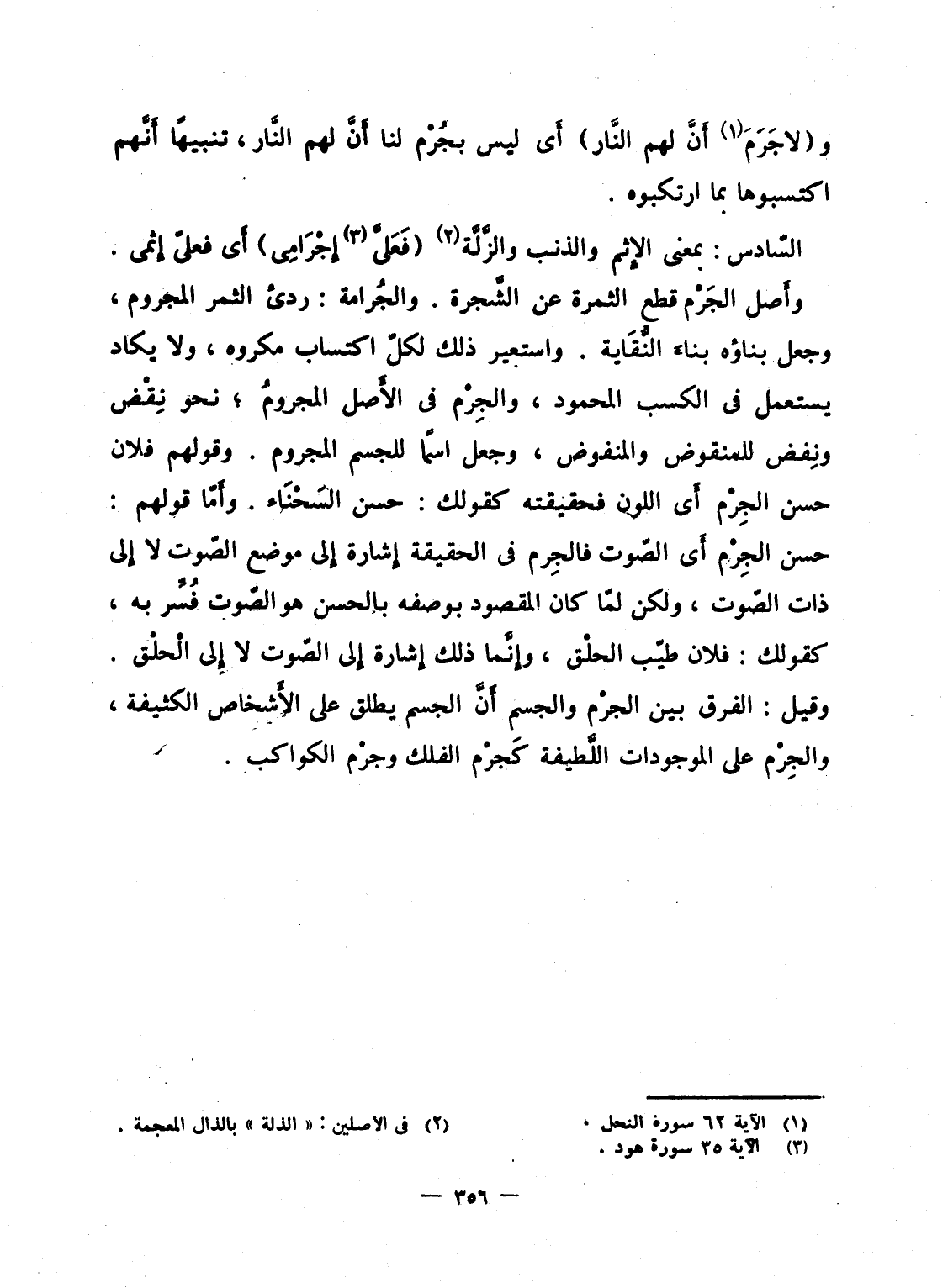 السّادس: بمعنى الإِثم والذنب والزَّلَّة {فَعَلَيَّ إِجْرَامِي} أَى فعلىّ إِثمى. وأَصل الجَرْم قطع الثمرة عن الشَّجرة. والجُرامة: ردئ الثمر المجروم، وجعل بناؤه بناءَ النُّقَاية. واستعير ذلك لكلّ اكتساب مكروه، ولا يكاد يستعمل فى الكسب المحمود، والجِرْم فى الأَصل المجرومُ؛ نحو نِقْض ونِفض للمنقوض والمنفوض، وجعل اسماً للجسم المجروم. وقولهم فلان حسن الجِرْم أَى اللون فحقيقته كقولك: حسن السَحْنَاء. وأَمّا قولهم: حسن الجِرْم أَى الصّوت فالجِرم فى الحقيقة إِشارة إِلى موضع الصّوت لا إِلى ذات الصّوت، ولكن لمّا كان المقصود بوصفه بالحسن هو الصّوت فُسِّر به، كقولك: فلان طيّب الحلْق، وإِنَّما ذلك إِشارة إِلى الصّوت لا إِلى الْحلْق. وقيل: الفرق بين الجرْم والجسم أَنَّ الجسم يطلق على الأَشخاص الكثيفة، والجِرْم على الموجودات اللَّطيفة كَجرْم الفلك وجرْم الكواكب.