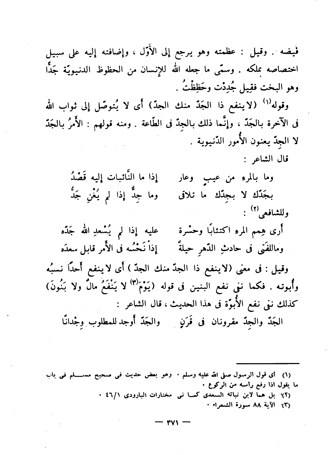 وقوله "لا ينفع ذا الجَدّ منك الجد" أَى لا يُتوصّل إِلى ثواب الله فى الآخرة بالجَدّ، وإِنَّما ذلك بالجِدّ فى الطّاعة. ومنه قولهم: الأَمرُ بالجَدّ لا الجِدّ يعنون الأُمور الدّنيوية.