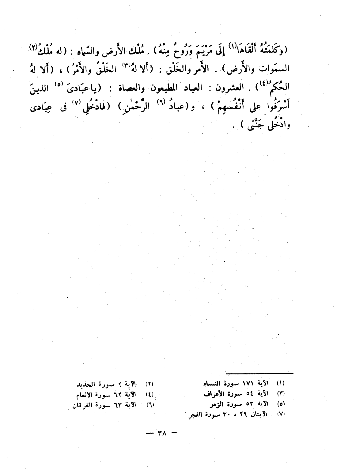 {وَكَلِمَتُهُ أَلْقَاهَا إلى مَرْيَمَ وَرُوحٌ مِّنْهُ} . مُلْك الأَرض والسّماءِ: {لَهُ مُلْكُ السماوات والأرض} . الأَمر والخَلق: {أَلاَ لَهُ الخلق والأمر} ، {أَلاَ لَهُ الحكم} . العشرون: العباد المطيعون والعصاة: {ياعبادي الذين أَسْرَفُواْ على أَنفُسِهِمْ} ، و {وَعِبَادُ الرحمان} {فادخلي فِي عِبَادِي وادخلي جَنَّتِي} .