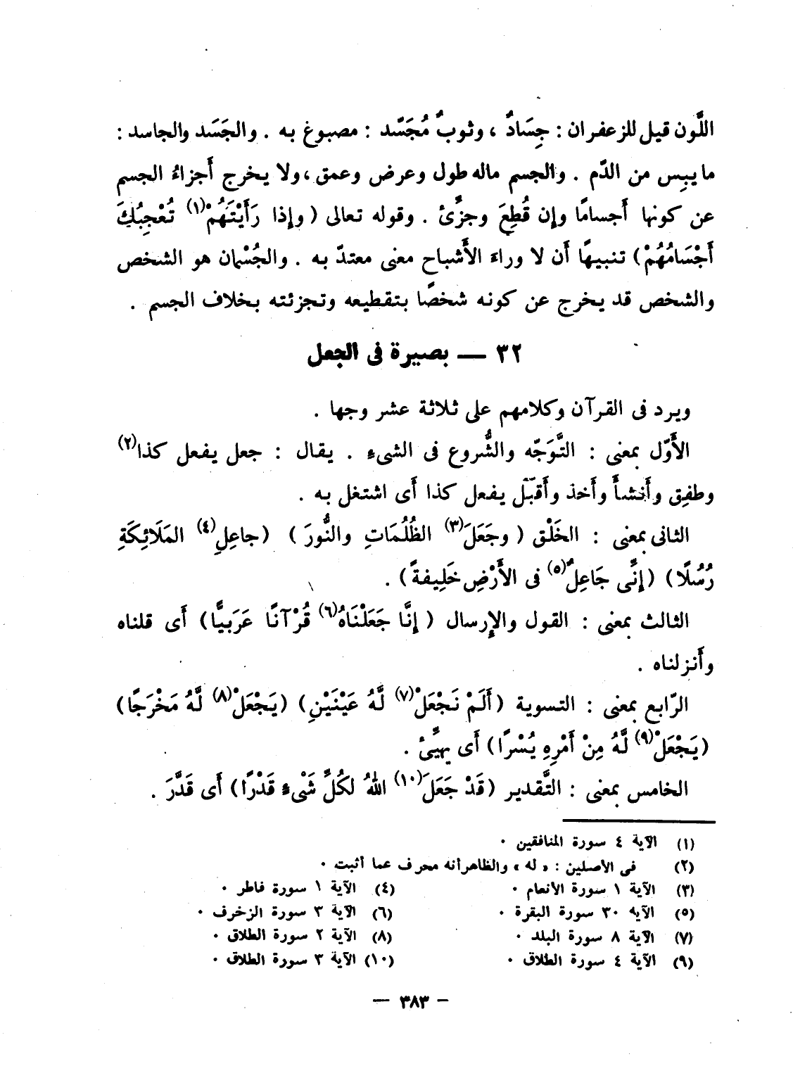 الثانى بمعنى: الخَلْق {وَجَعَلَ الظلمات والنور} {جَاعِلِ الملائكة رُسُلاً} {إِنِّي جَاعِلٌ فِي الأرض خَلِيفَةً} .