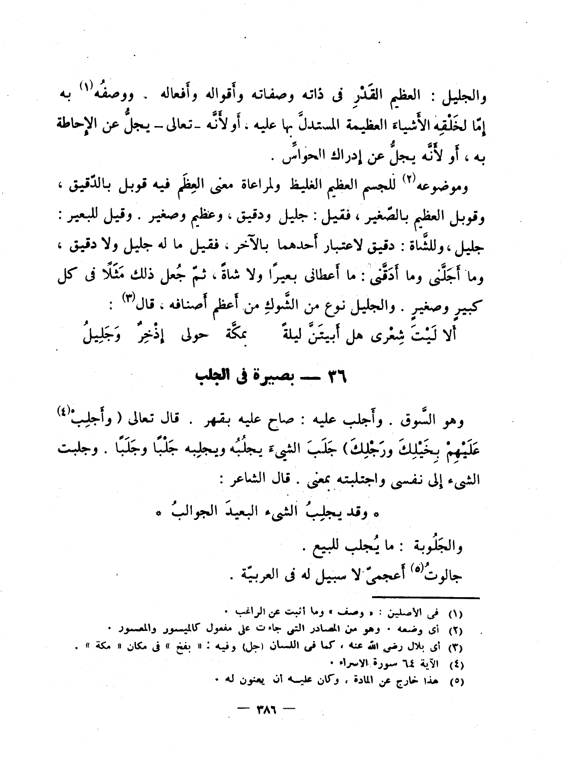وموضوعه للجسم العظيم الغليظ ولمراعاة معنى العِظَم فيه قوبل بالدّقيق، وقوبل العظيم بالصّغير. فقيل: جليل ودقيق، وعظيم وصغير. وقيل للبعير: جليل، وللشَّاة: دقيق لاعتبار أَحدهما بالآخر، فقيل ما له جليل ولا دقيق، وما أَجَلَّنى وما أَدَقَّنى: ما أَعطانى بعيراً ولا شاةً، ثمّ جُعل ذلك مَثَلاً فى كل كبيرٍ وصغيرٍ. والجليل نوع من الشَّوكِ من أَعظم أَصنافه، قال:
