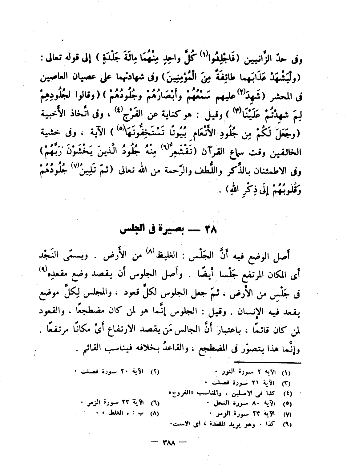 وفى حدّ الزَّانيين {فاجلدوا كُلَّ وَاحِدٍ مِّنْهُمَا مِئَةَ جَلْدَةٍ} إِلى قوله تعالى: {وَلْيَشْهَدْ عَذَابَهُمَا طَآئِفَةٌ مِّنَ المؤمنين} وفى شهادتهما على عصيان العاصين فى المحشر {شَهِدَ عَلَيْهِمْ سَمْعُهُمْ وَأَبْصَارُهُمْ وَجُلُودُهُم} {وَقَالُواْ لِجُلُودِهِمْ لِمَ شَهِدتُّمْ عَلَيْنَا} وقيل: هو كناية عن الفَرْج، وفى اتِّخاذ الأَخبية {وَجَعَلَ لَكُمْ مِّن جُلُودِ الأنعام بُيُوتاً تَسْتَخِفُّونَهَا} الآية، وفى خشية الخائفين وقت سماع القرآن {تَقْشَعِرُّ مِنْهُ جُلُودُ الذين يَخْشَوْنَ رَبَّهُمْ} وفى الاطمئنان بالذِّكر واللُّطف والرّحمة من الله تعالى {ثُمَّ تَلِينُ جُلُودُهُمْ وَقُلُوبُهُمْ إلى ذِكْرِ الله} .