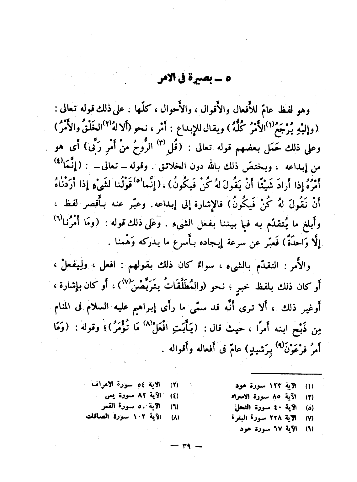وهو لفظ عامّ للأَفعال والأَقوال، والأَحوال، كلّها. على ذلك قوله تعالى: {وَإِلَيْهِ يُرْجَعُ الأمر كُلُّهُ} ويقال للإِبداع: أَمْر، نحو {أَلاَ لَهُ الخلق والأمر} وعلى ذلك حَمَل بعضهم قوله تعالى: {قُلِ الروح مِنْ أَمْرِ رَبِّي} أَى هو من إِبداعه، ويختصّ ذلك بالله دون الخلائق. وقوله - تعالى -: {إِنَّمَآ أَمْرُهُ إِذَآ أَرَادَ شَيْئاً أَن يَقُولَ لَهُ كُن فَيَكُونُ} ، {إِنَّمَا قَوْلُنَا لِشَيْءٍ إِذَآ أَرَدْنَاهُ أَن نَّقُولَ لَهُ كُنْ فَيَكُونُ} فالإِشارة إِلى إِبداعه. وعبّر عنه بأَقصر لفظ، وأَبلغ ما يُتقدّم به فيما بيننا بفعل الشئِ. وعلى ذلك قوله: {وَمَآ أَمْرُنَآ إِلاَّ وَاحِدَةٌ} فَعبّر عن سرعة إِيجاده بأَسرع ما يدركه وَهْمنا.