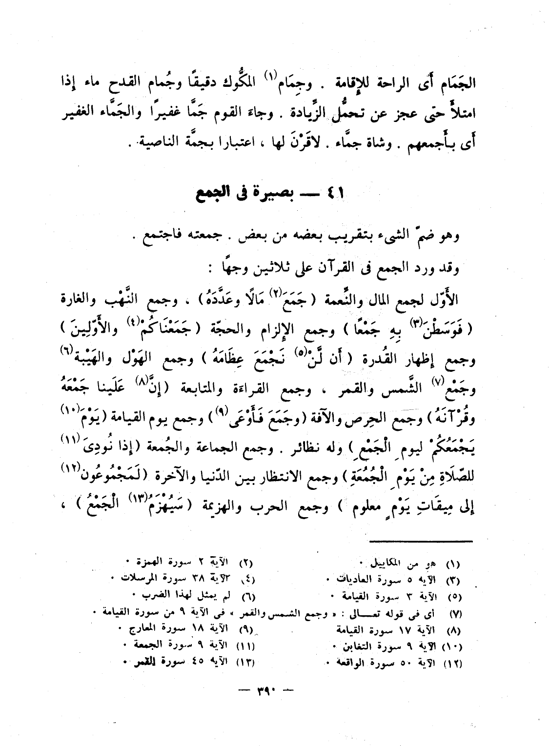 الأَوّل لجمع المال والنِّعمة {جَمَعَ مَالاً وَعَدَّدَهُ} ، وجمع النَّهْب والغارة {فَوَسَطْنَ بِهِ جَمْعاً} وجمع الإِلزام والحجّة {جَمَعْنَاكُمْ والأولين} وجمع إِظهار القُدرة {أَلَّن نَّجْمَعَ عِظَامَهُ} وجمع الهَوْل والهَيْبة وجَمْع الشَّمس والقمر، وجمع القراءَة والمتابعة {إِنَّ عَلَيْنَا جَمْعَهُ وَقُرْآنَهُ} وجمع الحِرص والآفة {وَجَمَعَ فأوعى} وجمع يوم القيامة {يَوْمَ يَجْمَعُكُمْ لِيَوْمِ الجمع} وله نظائر. وجمع الجماعة والجُمعة {إِذَا نُودِيَ لِلصَّلاَةِ مِن يَوْمِ الجمعة} وجمع الانتظار بين الدّنيا والآخرة {لَمَجْمُوعُونَ إلى مِيقَاتِ يَوْمٍ مَّعْلُومٍ} وجمع الحرب والهزيمة {سَيُهْزَمُ الجمع} ،
