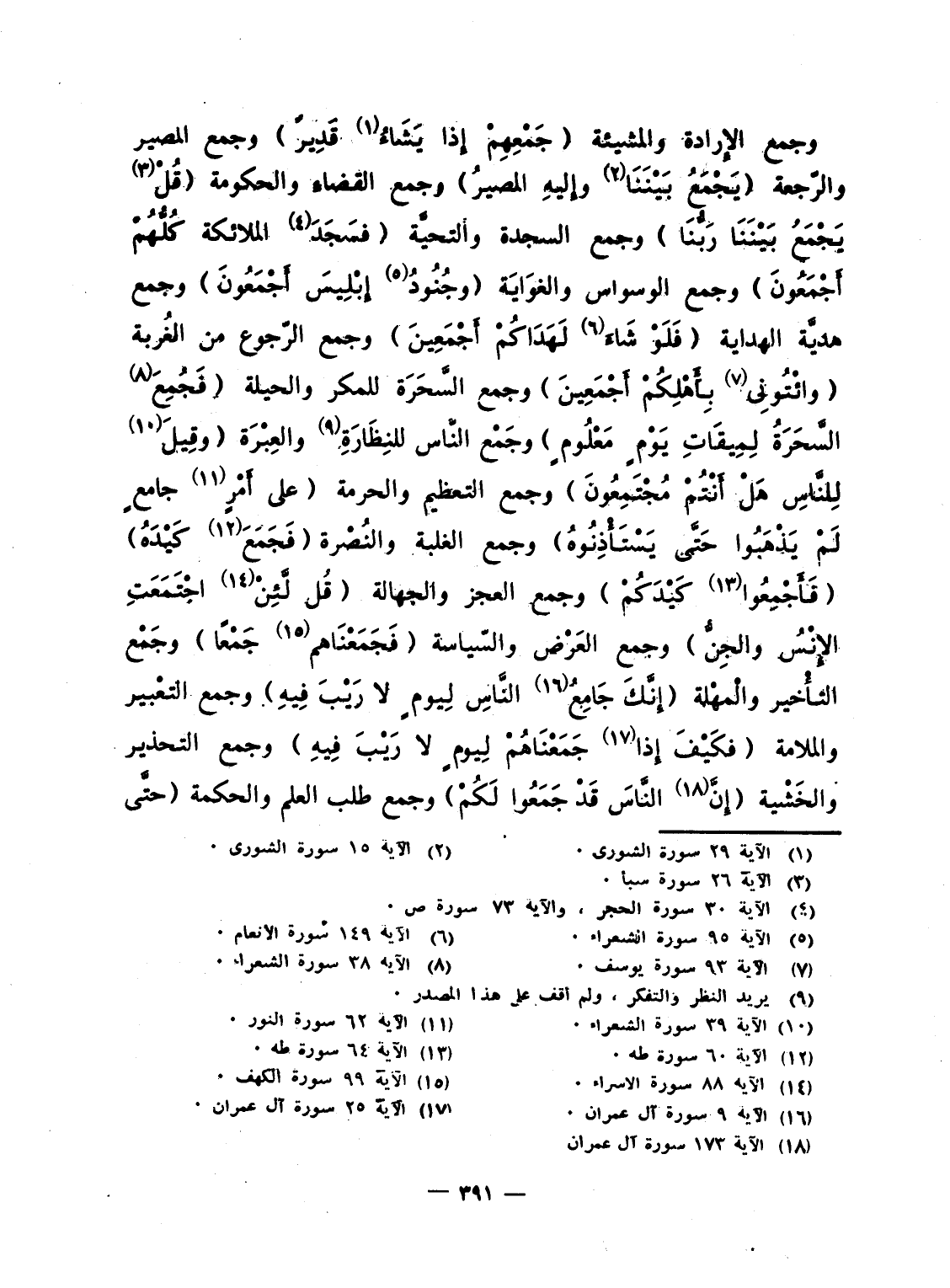 وجمع الإِرادة والمشيئة {جَمْعِهِمْ إِذَا يَشَآءُ قَدِيرٌ} وجمع المصير والرّجعة {يَجْمَعُ بَيْنَنَا وَإِلَيْهِ المصير} وجمع القضاءِ والحكومة {قُلْ يَجْمَعُ بَيْنَنَا رَبُّنَا} وجمع السجدة والتحيَّة {فَسَجَدَ الملائكة كُلُّهُمْ أَجْمَعُونَ} وجمع الوسواس والغوَايَة {وَجُنُودُ إِبْلِيسَ أَجْمَعُونَ} وجمع هديَّة الهداية {فَلَوْ شَآءَ لَهَدَاكُمْ أَجْمَعِينَ} وجمع الرّجوع من الغُربة {وَأْتُونِي بِأَهْلِكُمْ أَجْمَعِينَ} وجمع السَّحَرَة للمكر والحيلة {فَجُمِعَ السحرة لِمِيقَاتِ يَوْمٍ مَّعْلُومٍ} وجَمْع النَّاس للنِظَارَةِ والعِبْرَة {وَقِيلَ لِلنَّاسِ هَلْ أَنتُمْ مُّجْتَمِعُونَ} وجمع التعظيم والحرمة {على أَمْرٍ جَامِعٍ لَّمْ يَذْهَبُواْ حتى يَسْتَأْذِنُوهُ} وجمع الغلبة والنُصرة {فَجَمَعَ كَيْدَهُ} {فَأَجْمِعُواْ كَيْدَكُمْ} وجمع العجز والجهالة {قُل لَّئِنِ اجتمعت الإنس والجن} وجمع العَرْض والسّياسة {فَجَمَعْنَاهُمْ جَمْعاً} وجَمْع التأْخير والْمهْلة {إِنَّكَ جَامِعُ الناس لِيَوْمٍ لاَّ رَيْبَ فِيهِ} وجمع التعْبير والملامة {فَكَيْفَ إِذَا جَمَعْنَاهُمْ لِيَوْمٍ لاَّ رَيْبَ فِيهِ} وجمع التحذير والخَشية {إِنَّ الناس قَدْ جَمَعُواْ لَكُمْ} وجمع طلب العلم والحكمة {حتى