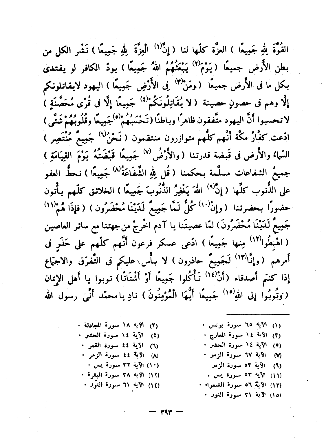 القوة للَّهِ جَمِيعاً} العزَّة كلّها لنا {إِنَّ العزة للَّهِ جَمِيعاً} نَشْر الكل من بطن الأَرض جميعاً {يَوْمَ يَبْعَثُهُمُ الله جَمِيعاً} يودّ الكافر او يفتدى بكل ما فى الأَرض جميعاً {وَمَن فِي الأرض جَمِيعاً} اليهود لا يقاتلونكم إِلاَّ وهم فى حصونٍ حصينة {لاَ يُقَاتِلُونَكُمْ جَمِيعاً إِلاَّ فِي قُرًى مُّحَصَّنَةٍ} لا تحسبوا أَنَّ اليهود متَّفقون ظاهراً وباطناً {تَحْسَبُهُمْ جَمِيعاً وَقُلُوبُهُمْ شتى} ادّعت كفَّارُ مكَّة أَنَّهم كلُّهم متوازرون منتقمون {نَحْنُ جَمِيعٌ مُّنتَصِرٌ} السّماءُ والأَرض فى قَبضة قدرتنا {والأرض جَمِيعاً قَبْضَتُهُ يَوْمَ القيامة} جميعُ الشفاعات مسلَّمة بحكمنا {قُل لِلَّهِ الشفاعة جَمِيعاً} نحطُّ العفو على الذنُّوب كلِّها {إِنَّ الله يَغْفِرُ الذنوب جَمِيعاً} الخلائق كلّهم يأْتون حضوراً بحضرتنا {وَإِن كُلٌّ لَّمَّا جَمِيعٌ لَّدَيْنَا مُحْضَرُونَ} {فَإِذَا هُمْ جَمِيعٌ لَّدَيْنَا مُحْضَرُونَ} لمّا عصيتَنا يا آدم اخْرجْ من جهتنا مع سائر العاصين {اهبطوا مِنْهَا جَمِيعاً} ادّعى عسكر فرعون أَنَّهم كلّهم على حَذَرٍ فى أَمرهم {وَإِنَّا لَجَمِيعٌ حَاذِرُونَ} لا بأْس عليكم فى التَّفرّق والاجتماع إِذا كنتم أَصدقاء {أَن تَأْكُلُواْ جَمِيعاً أَوْ أَشْتَاتاً} توبوا يا أَهل الإِيمان {وتوبوا إِلَى الله جَمِيعاً أَيُّهَ المؤمنون} نادِ يا محمّد أَنِّى رسول الله