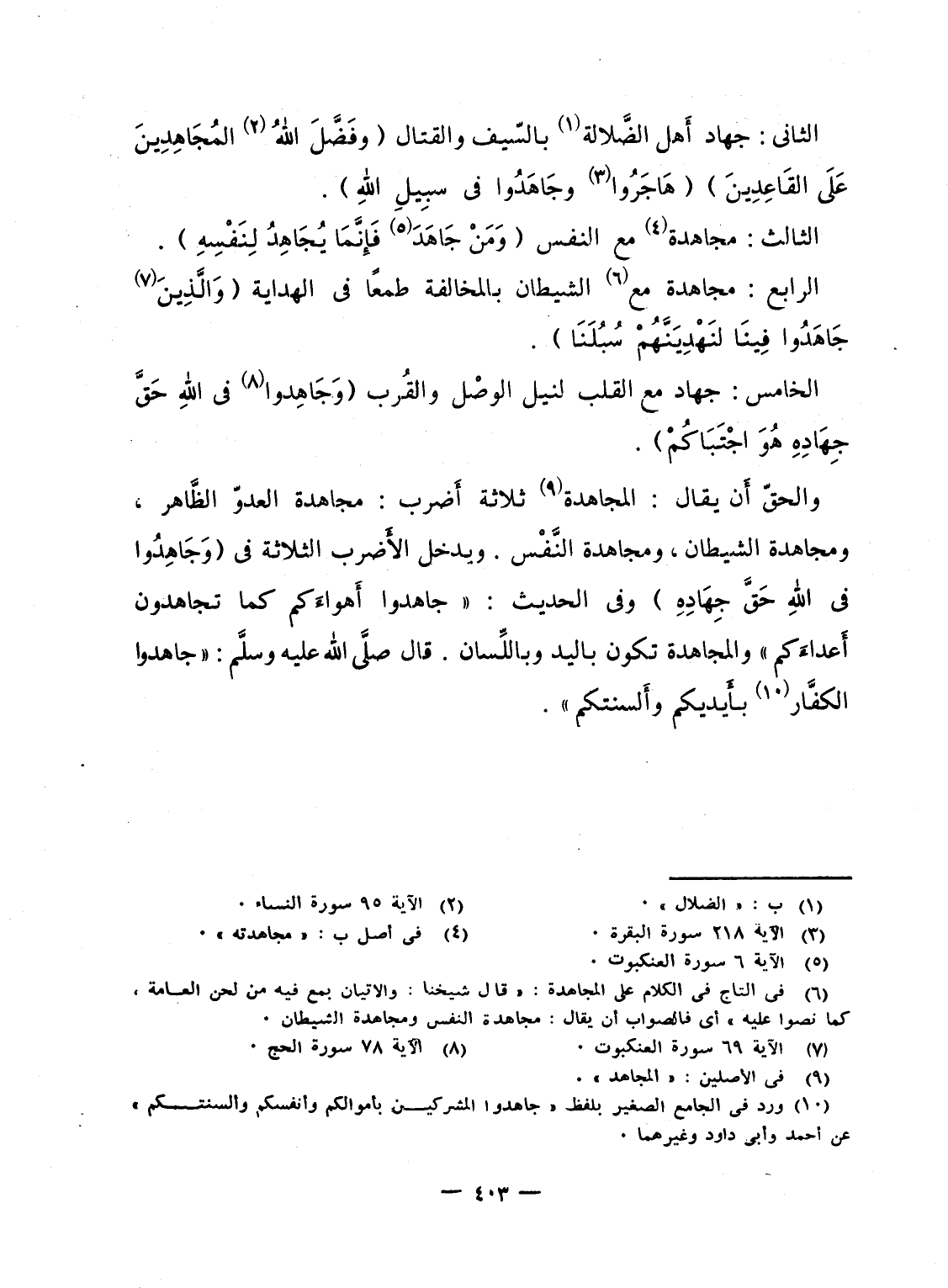 والحقّ أَن يقال: المجاهدة ثلاثة أَضرب: مجاهدة العدوّ الظَّاهر، ومجاهدة الشيطان، ومجاهدة النَّفْس. ويدخل الأَضرب الثلاثة فى {وَجَاهِدُوا فى اللهِ حَقَّ جِهَادِهِ} وفى الحديث: "جاهدوا أَهواءَكم كما تجاهدون أَعداءَكم" والمجاهدة تكون باليد واللِّسان. قال صلَّى الله عليه وسلَّم: "جاهدوا الكفَّار بأَيديكم وأَلسنتكم".
