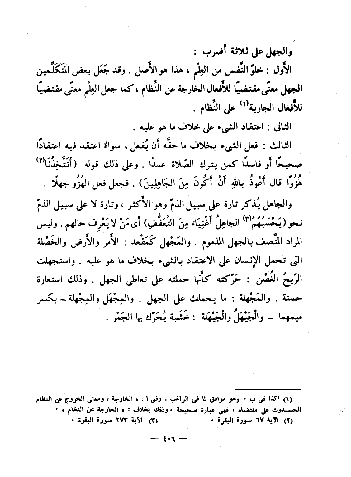 الثالث: فعل الشئ بخلاف ما حقًَّه أَن يُفعل، سواءٌ اعتقد فيه اعتقاداً صحيحاً أَو فاسداً كمن يترك الصّلاة عمداً. وعلى ذلك قوله {أَتَتَّخِذُنَا هُزُواً قَالَ أَعُوذُ بالله أَنْ أَكُونَ مِنَ الجاهلين} . فجعل فعل الهُزُو جهلاً.