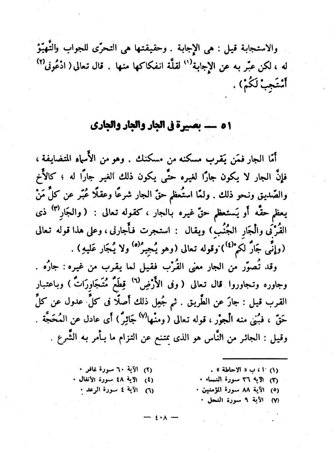 أَمّا الجار فمَن يَقرب مسكنه من مسكنك. وهو من الأَسماءِ المتضايفة، فإِنَّ الجار لا يكون جاراً لغيره حتَّى يكون ذلك الغير جاراً له؛ كالأَخ والصّديق ونحو ذلك. ولمّا استُعظم حقّ الجار شرعاً وعقلاً عُبّر عن كلِّ مَنْ يعظم حقَّه أَو يَستعظم حقّ غيره بالجار، كقوله تعالى {والجار ذِي القربى والجار الجنب} ويقال: استجرت فأَجارنى، وعلى هذا قوله تعالى {وَإِنِّي جَارٌ لَّكُمْ} وقوله تعالى {وَهُوَ يُجْيِرُ وَلاَ يُجَارُ عَلَيْهِ} .