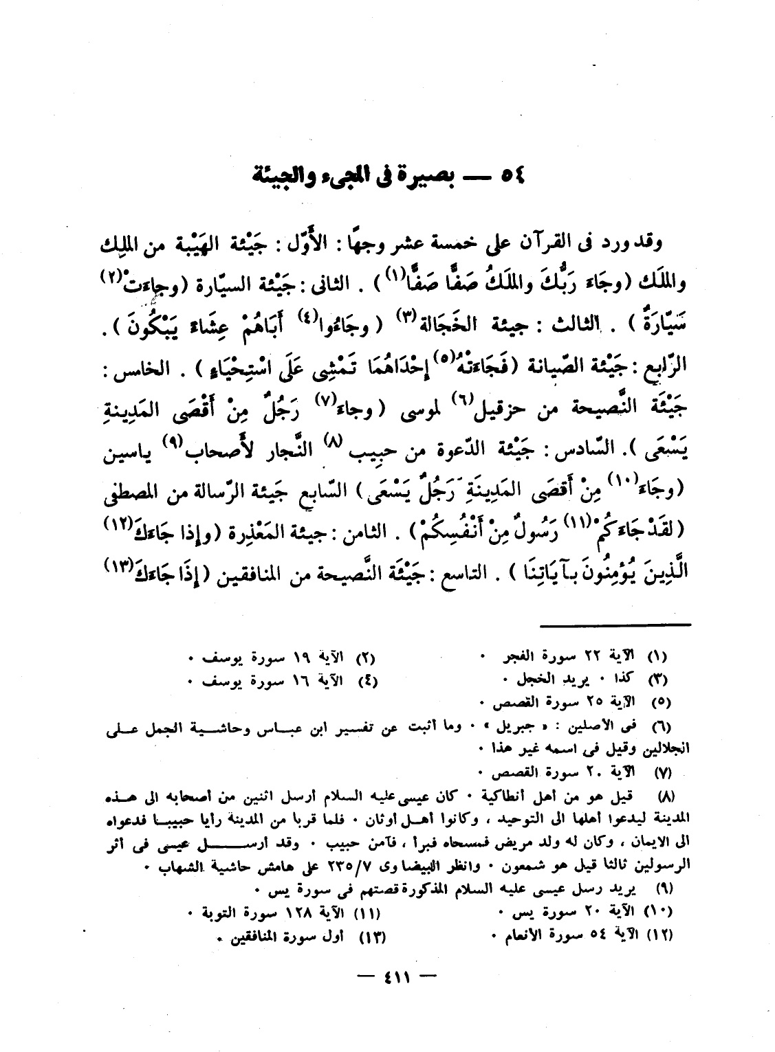 وقد ورد فى القرآن على خمسة عشر وجهاً: الأَوّل: جَيْئة الهَيْبة من الملِك والملَك {وَجَآءَ رَبُّكَ والملك صَفّاً صَفّاً} . الثانى: جَيْئة السيّارة {وَجَاءَتْ سَيَّارَةٌ} . الثالث: جيئة الخَجَالة {وجآءوا أَبَاهُمْ عِشَآءً يَبْكُونَ} . الرّابع: جَيْئة الصّيانة {فَجَآءَتْهُ إِحْدَاهُمَا تَمْشِي عَلَى استحيآء} . الخامس: جَيْئَة النَّصيحة من حزقيل لموسى {وَجَآءَ رَجُلٌ مِّنْ أَقْصَى المدينة يسعى} . السّادس: جَيْئة الدّعوة من حبِيب النَّجار لأَصحاب ياسين {وَجَآءَ مِنْ أَقْصَى المدينة رَجُلٌ يسعى} السّابع جَيئة الرّسالة من المصطفى {لَقَدْ جَآءَكُمْ رَسُولٌ مِّنْ أَنفُسِكُمْ} . الثامن: جيئة المَعْذِرة {وَإِذَا جَآءَكَ الذين يُؤْمِنُونَ بِآيَاتِنَا} . التاسع: جَيْئَة النَّصيحة من المنافقين {إِذَا جَآءَكَ