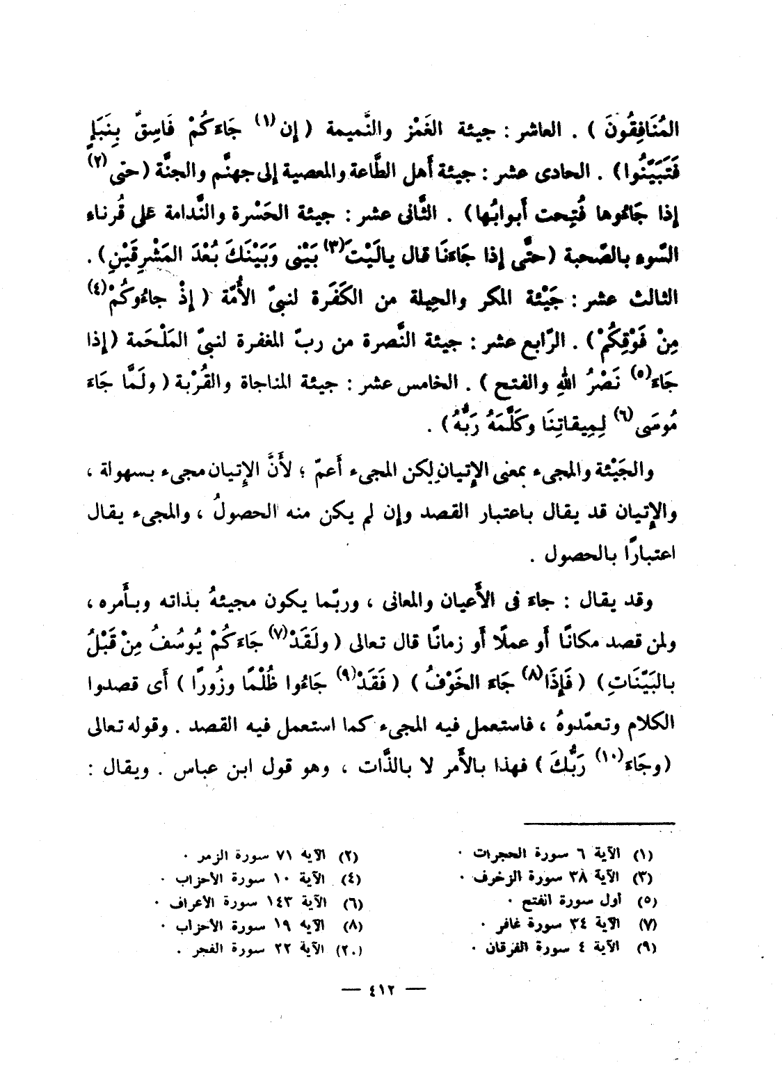 المنافقون} . العاشر: جيئة الغَمْز والنَّميمة {إِن جَآءَكُمْ فَاسِقٌ بِنَبَإٍ فتبينوا} . الحادى عشر: جيئة أَهل الطَّاعة والمعصية إِلى جهنَّم والجنَّة {حتى إِذَا جَآءُوهَا فُتِحَتْ أَبْوَابُهَا} . الثَّانى عشر: جيئة الحَسْرة والنَّدامة على قُرناءِ السّوءِ بالصّحبة {حتى إِذَا جَآءَنَا قَالَ ياليت بَيْنِي وَبَيْنَكَ بُعْدَ المشرقين} . الثالث عشر: جَيْئة المكر والحِيلة من الكَفَرة لبنىّ الأُمّة {إِذْ جَآءُوكُمْ مِّن فَوْقِكُمْ} . الرّابع عشر: جيئة النَّصرة من ربّ المغفرة لنبىّ المَلْحَمة {إِذَا جَآءَ نَصْرُ الله والفتح} . الخامس عشر: جيئة المناجاة والقُرْبة {وَلَمَّا جَآءَ موسى لِمِيقَاتِنَا وَكَلَّمَهُ رَبُّهُ} .
