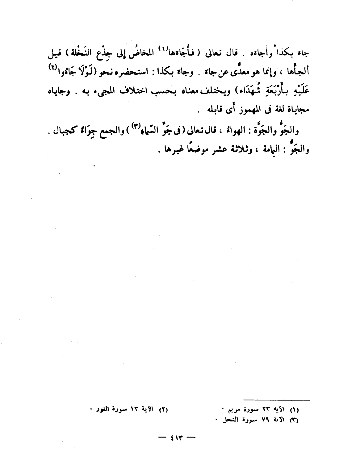 جاء بكذا وأَجاءَه. قال تعالى {فَأَجَآءَهَا المخاض إلى جِذْعِ النخلة} قيل ألجأَها، وإِنما هو معدّىً عن جاءَ. وجاءَ بكذا: استحضره نحو {لَّوْلاَ جَآءُوا عَلَيْهِ بِأَرْبَعَةِ شُهَدَآءَ} ويختلف معناه بحسب اختلاف المجئ به. وجاياه مجاياة لغة فى المهموز أَى قابله.