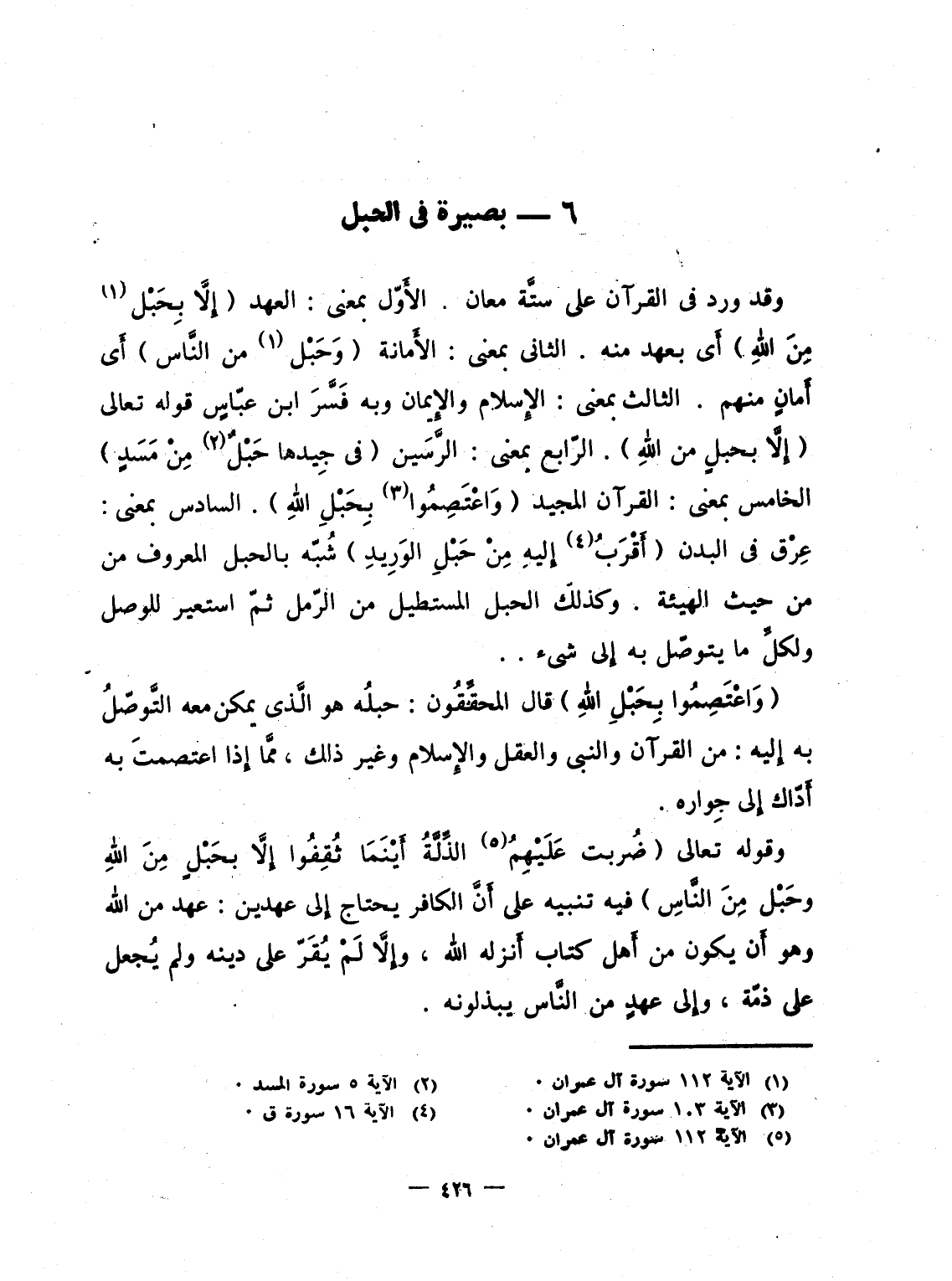 وقد ورد فى القرآن على ستَّة معان. الأَوّل بمعنى: العهد {إِلاَّ بِحَبْلٍ مِّنَ الله} أَى بعهد منه. الثانى بمعنى: الأَمانة {وَحَبْلٍ مِّنَ الناس} أَى أَمانٍ منهم. الثالث بمعنى: الإِسلام والإِيمان وبه فَسَّرَ ابن عبّاسٍ قوله تعالى {إِلاَّ بحبلٍ من اللهِ} . الرّابع بمعنى: الرَّسَين {فِي جِيدِهَا حَبْلٌ مِّن مَّسَدٍ} الخامس بمعنى: القرآن المجيد {واعتصموا بِحَبْلِ الله} . السادس بمعنى: عِرْق فى البدن {أَقْرَبُ إِلَيْهِ مِنْ حَبْلِ الوريد} شُبّه بالحبل المعروف من حيث الهيئة. وكذلك الحبل المستطيل من الرّمل ثمّ استعير للوصل ولكلِّ ما يتوصّل به إِلى شئ..