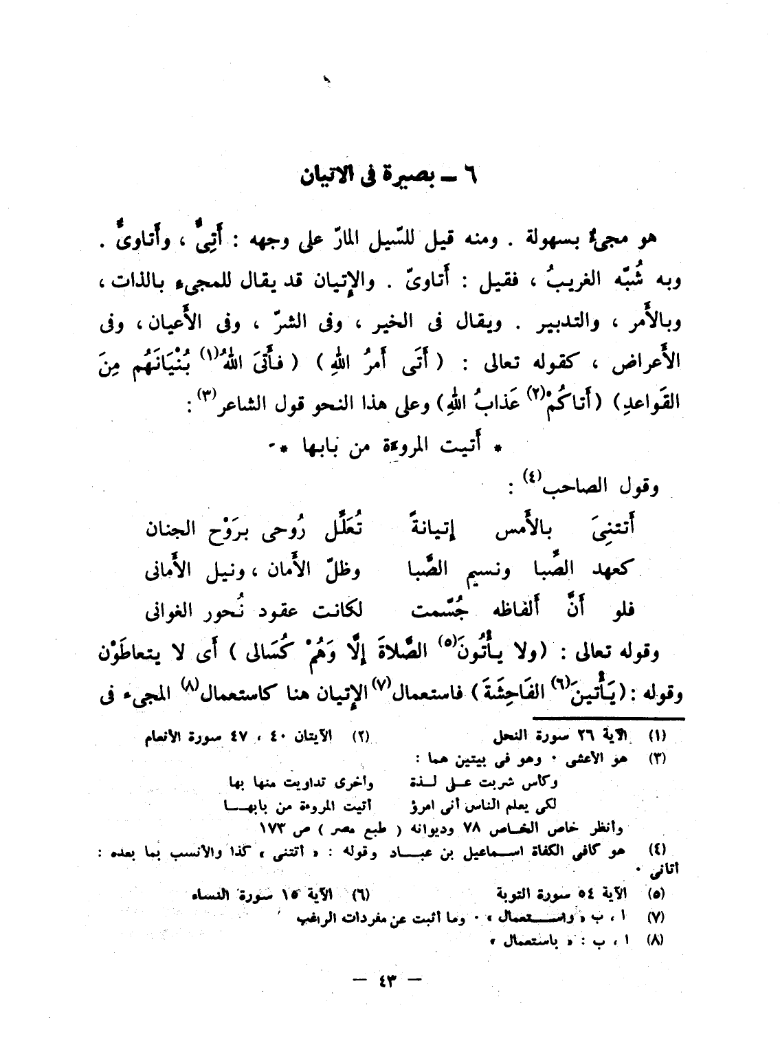 هو مجىءٌ بسهولة. ومنه قيل للسّيل المارّ على وجهه: أَتِىُّ، وأَتاوىٌّ. وبه شُبّه الغريبُ، فقيل: أَتاوىّ. والإِتيان قد يقال للمجىءِ بالذات، وبالأَمر، والتدبير. ويقال فى الخير، وفى الشرّ، وفى الأَعيان، وفى الأَعراض، كقوله تعالى: {أَتَى أَمرُ اللهِ} {فَأَتَى الله بُنْيَانَهُمْ مِّنَ القواعد} {أَتَاكُمْ عَذَابُ الله} وعلى هذا النحو قول الشاعر: