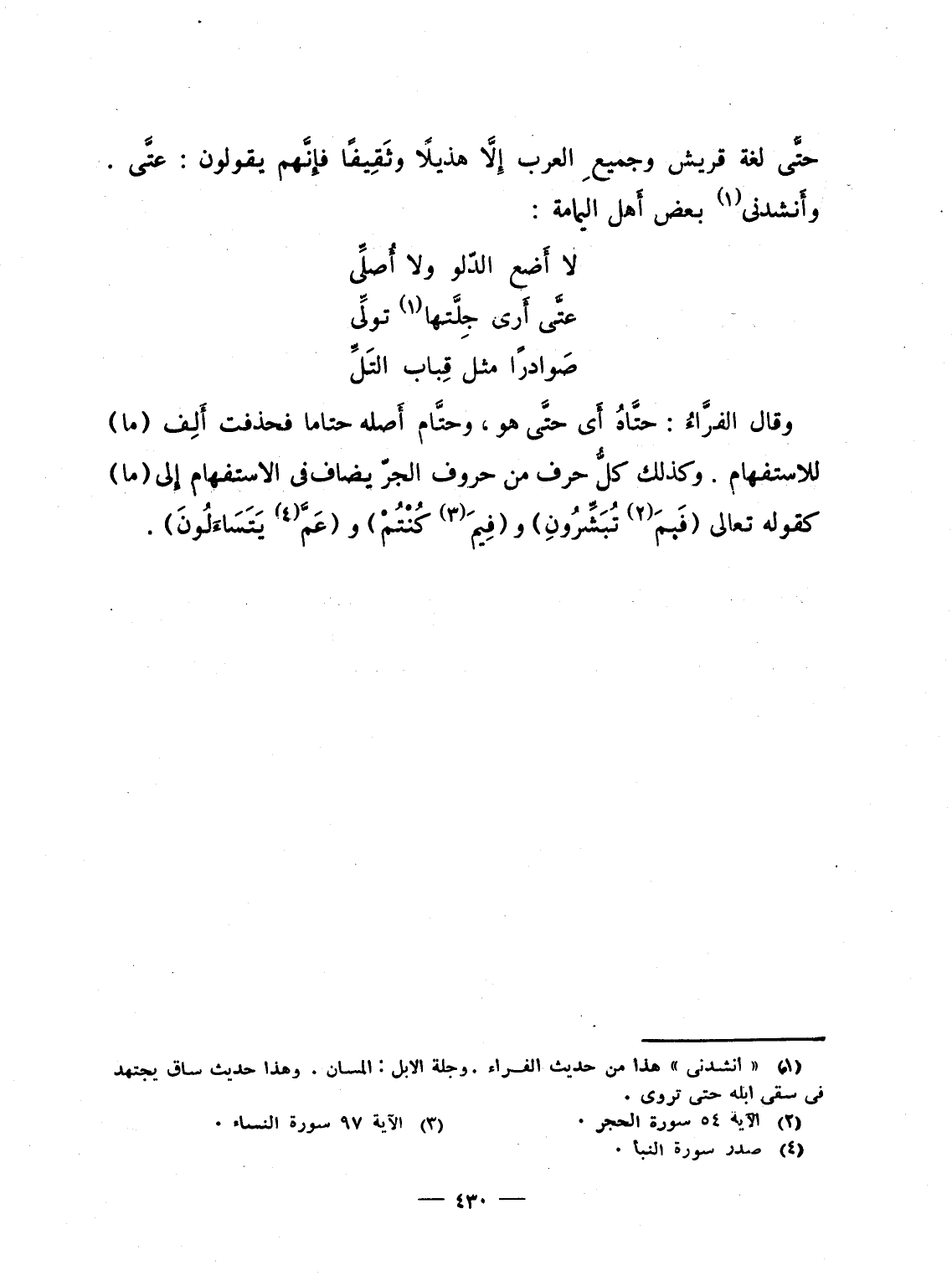 حتَّى لغة قريش وجميعِ العرب إِلاَّ هذيلاً وثَقِيفاً فإِنَّهم يقولون: عتَّى. وأَنشدنى بعض أَهل اليمامة: