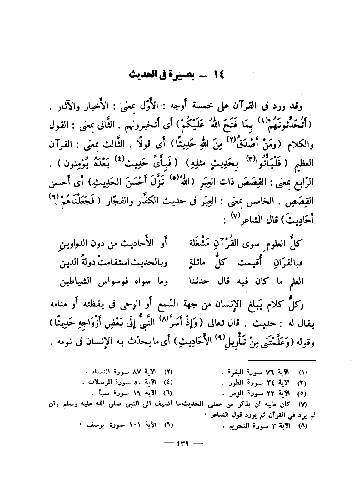وقد ورد فى القرآن على خمسة أَوجه: الأَوّل بمعنى: الأَخبار والآثار. {أَتُحَدِّثُونَهُم بِمَا فَتَحَ الله عَلَيْكُمْ} أَى أَتخبرونهم. الثَّانى بمعنى: القول والكلام {وَمَنْ أَصْدَقُ مِنَ الله حَدِيثاً} أَى قولاً. الثَّالث بمعنى: القرآن العظيم {فَلْيَأْتُواْ بِحَدِيثٍ مِّثْلِهِ} {فَبِأَيِّ حَدِيثٍ بَعْدَهُ يُؤْمِنُونَ} . الرّابع بمعنى: القِصَصَ ذات العِبَرِ {الله نَزَّلَ أَحْسَنَ الحديث} أَى أَحسن القِصَصِ. الخامس بمعنى: العِبَر فى حديث الكفَّار والفجّار {فَجَعَلْنَاهُمْ أَحَادِيثَ} قال الشاعر: