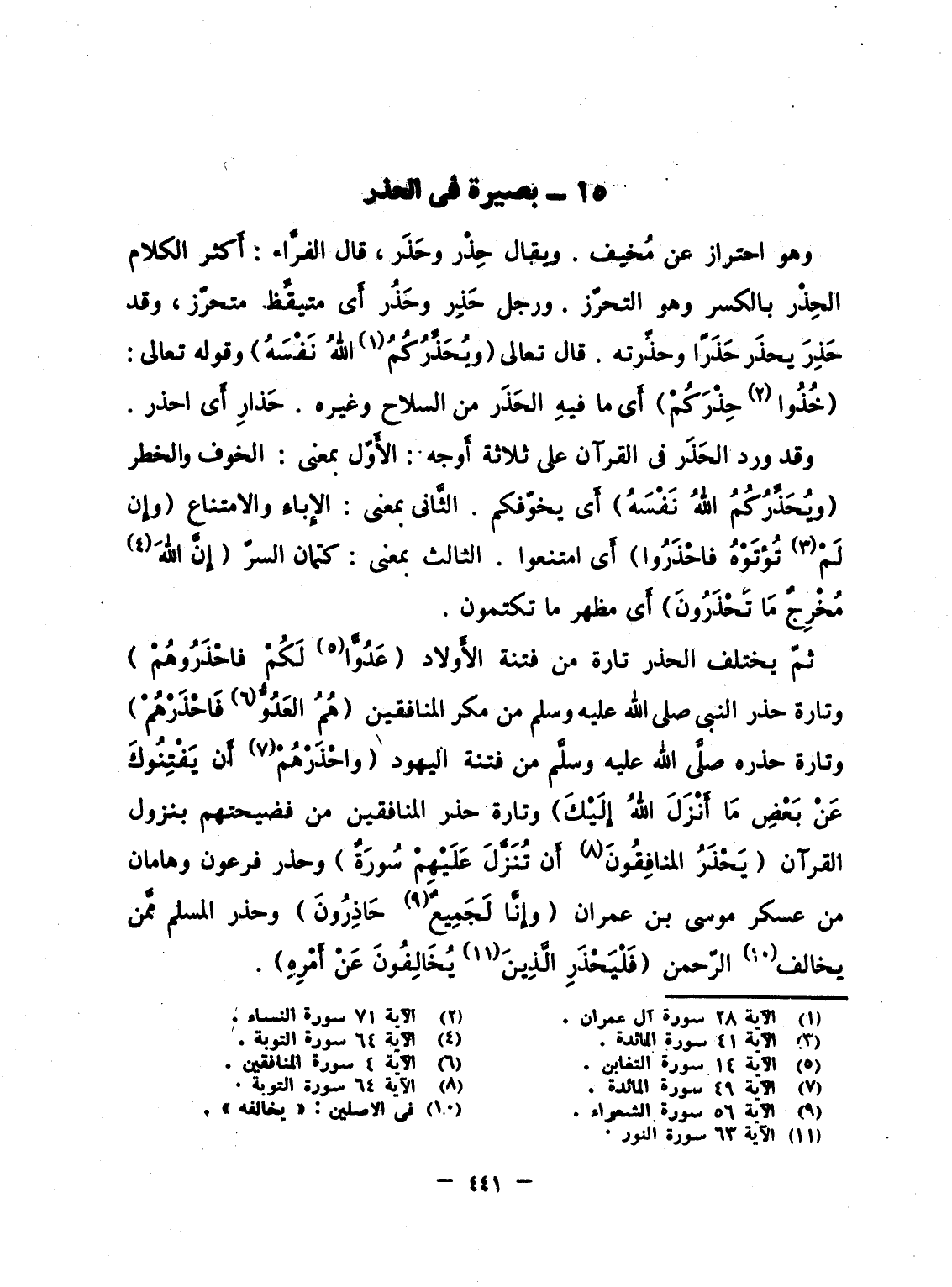 ثمّ يختلف الحذر تارة من فتنة الأَولاد {عَدُوّاً لَّكُمْ فاحذروهم} وتارة حذر النبى صلى الله عليه وسلم من مكر المنافقين {هُمُ العدو فاحذرهم} وتارة حذره صلَّى الله عليه وسلَّم من فتنة اليهود {واحذرهم أَن يَفْتِنُوكَ عَن بَعْضِ مَآ أَنزَلَ الله إِلَيْكَ} وتارة حذر المنافقين من فضيحتهم بنزول القرآن {يَحْذَرُ المنافقون أَن تُنَزَّلَ عَلَيْهِمْ سُورَةٌ} وحذر فرعون وهامان من عسكر موسى بن عمران {وَإِنَّا لَجَمِيعٌ حَاذِرُونَ} وحذر المسلم ممَّن يخالف الرّحمن {فَلْيَحْذَرِ الذين يُخَالِفُونَ عَنْ أَمْرِهِ} .
