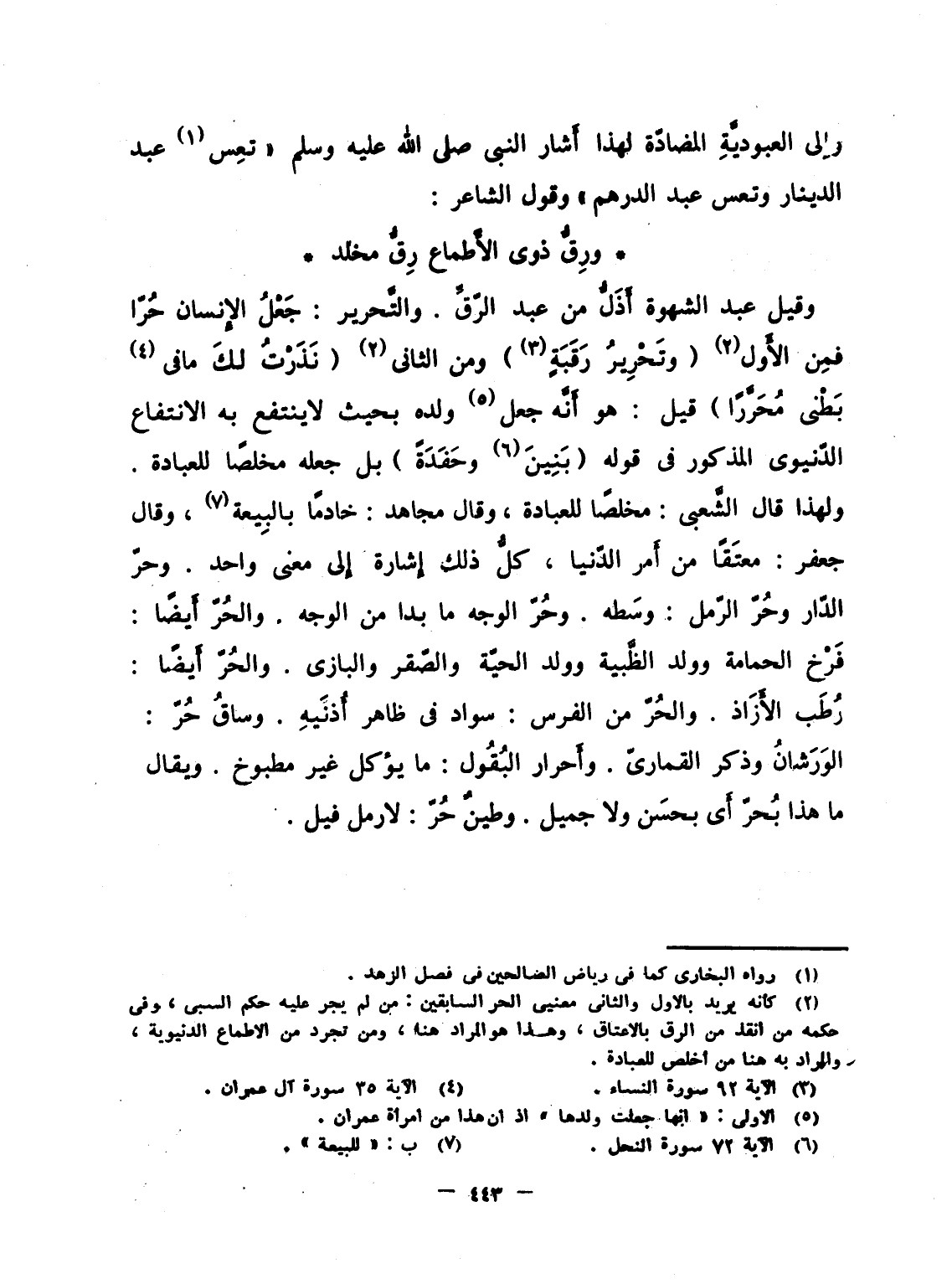 وإِلى العبوديَّةِ المضادّة لهذا أَشار النبى صلى الله عليه وسلم "تعِس عبد الدينار وتعس عبد الدرهم" وقول الشاعر:
