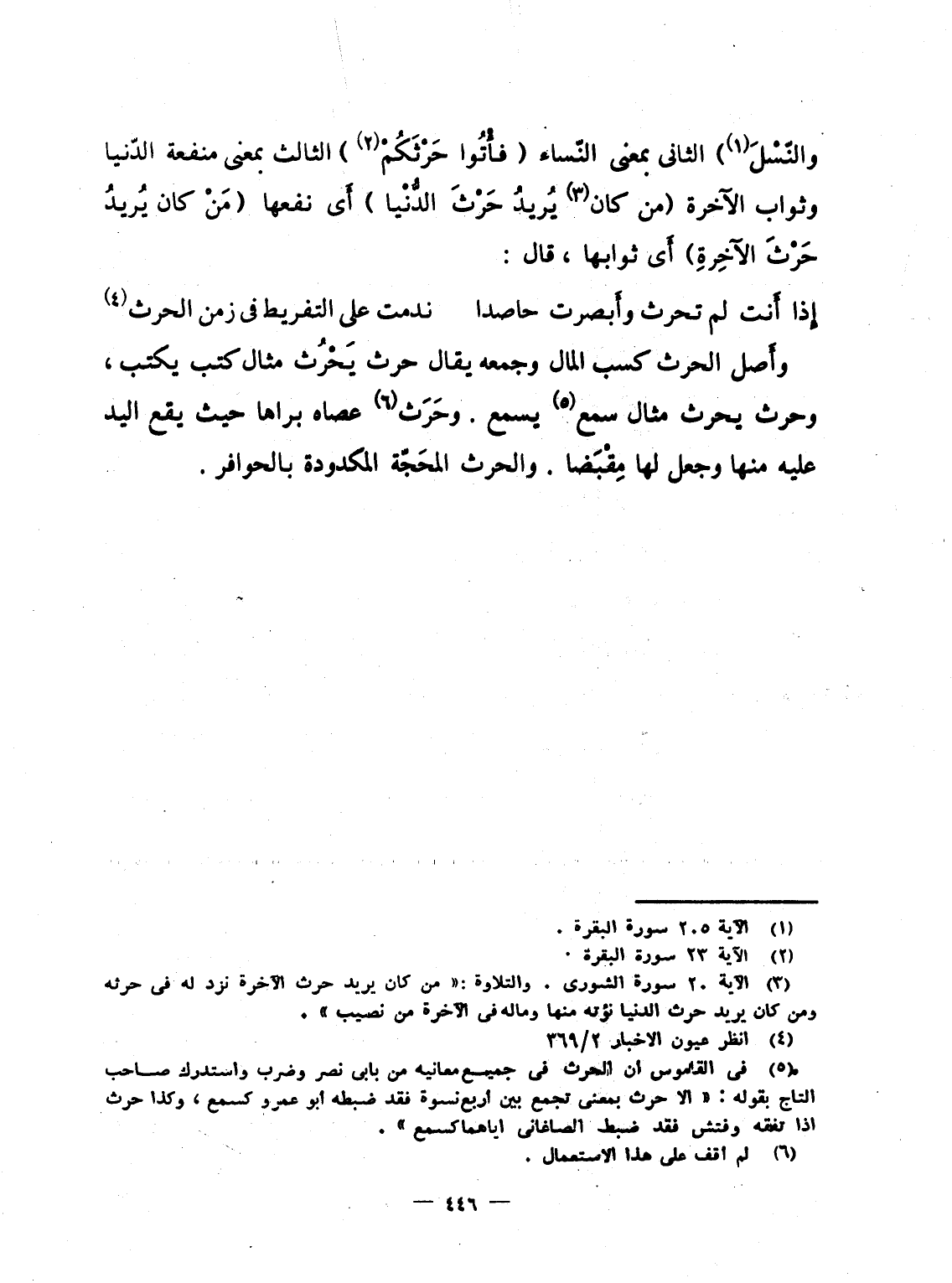 والنسل} الثانى بمعنى النساء {فَأْتُواْ حَرْثَكُمْ} الثالث بمعنى منفعة الدّنيا وثواب الآخرة {وَمَن كَانَ يُرِيدُ حَرْثَ الدنيا} أَى نفعها {مَنْ كان يُريدُ حَرْثَ الآخِرةِ} أَى ثوابها، قال: