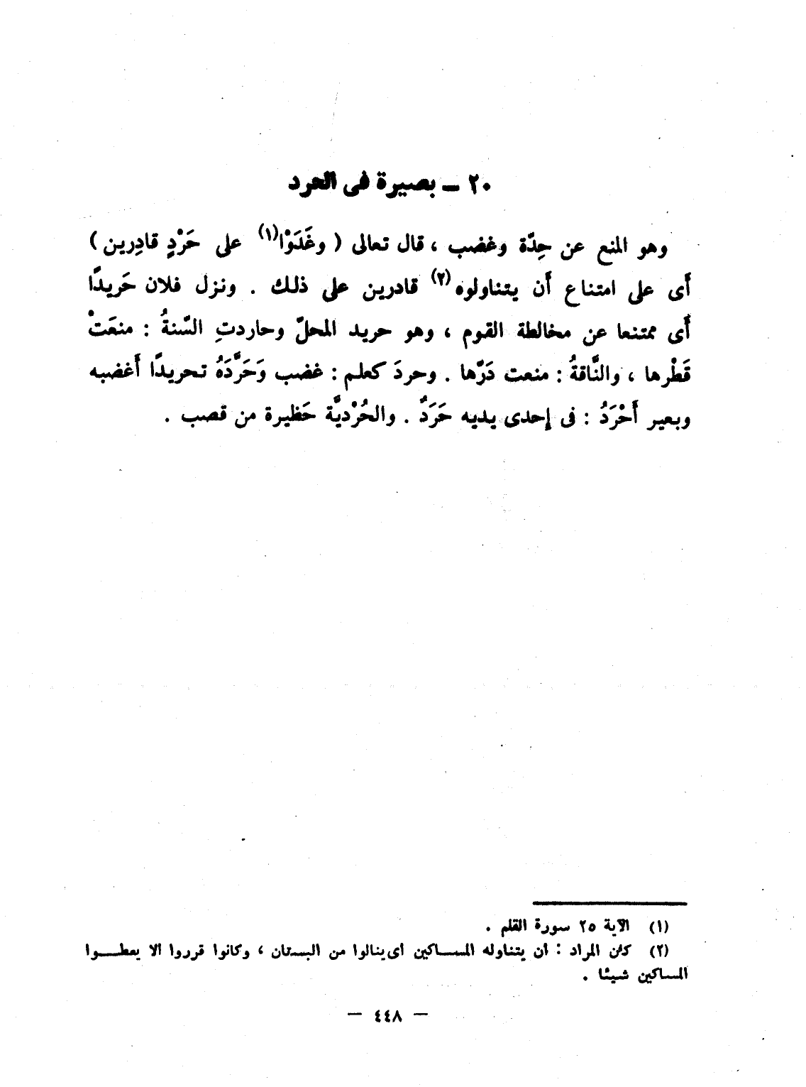 وهو المنع عن حِدّة وغضب، قال تعالى {وَغَدَوْاْ على حَرْدٍ قَادِرِينَ} أَى على امتناع أَن يتناولوه قادرين على ذلك. ونزل فلان حَريداً أَى ممتنعا عن مخالطة القوم، وهو حريد المحلّ وحاردتِ السّنةُ: منعَتْ قَطْرها، والنَّاقةُ: منعت دَرّها. وحردَ كعلم: غضب وَحَرَّدَهُ تحريداً أَغضبه وبعير أَحْرَدُ: فى إِحدى يديه حَرَدٌ. والحُرْديَّة حَظيرة من قصب.
