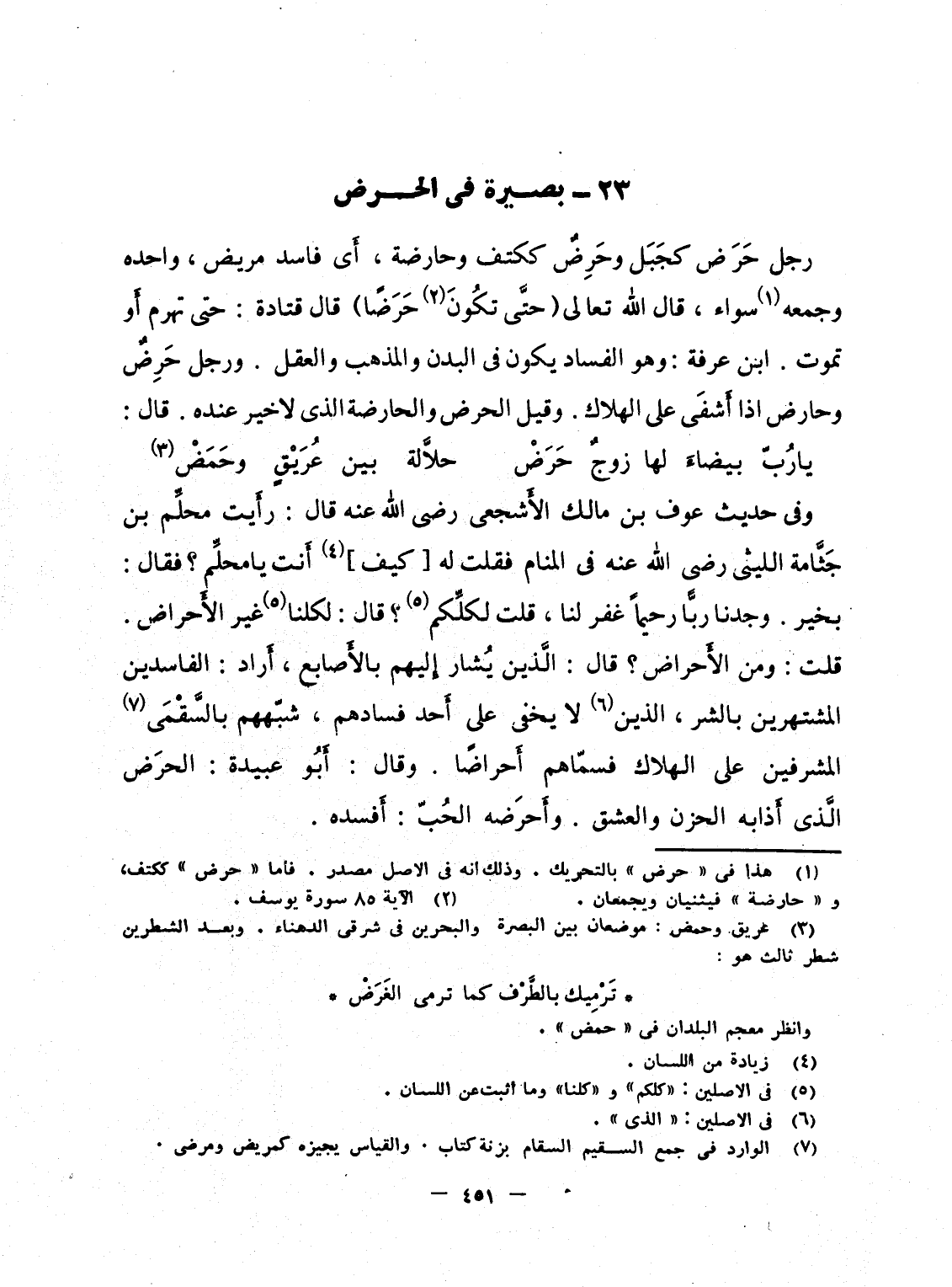 وفى حديث عوف بن مالك الأَشجعى رضى الله عنه قال: رأَيت محلِّم بن جَثَّامة الليثى رضى الله عنه فى المنام فقلت له [كيف] أَنت يا محلِّم؟ فقال: بخير. وجدنا ربّاً رحيماً غفر لنا، قلت لكلِّكم؟ قال: لكلنا غير الأَحراض. قلت: ومن الأَحراض؟ قال: الَّذين يُشار إِليهم بالأَصابع، أَراد الفاسدين المشتهرين بالشر، الذين لا يخفى على أحد فسادهم، شبّههم بالسَّقْمَى المشرفين على الهلاك فسمّاهم أَحراضاً. وقال: أَبُو عبيدة: الحرَض الَّذى أَذابه الحزن والعشق. وأَحرضَه الحُبّ: أَفسده.