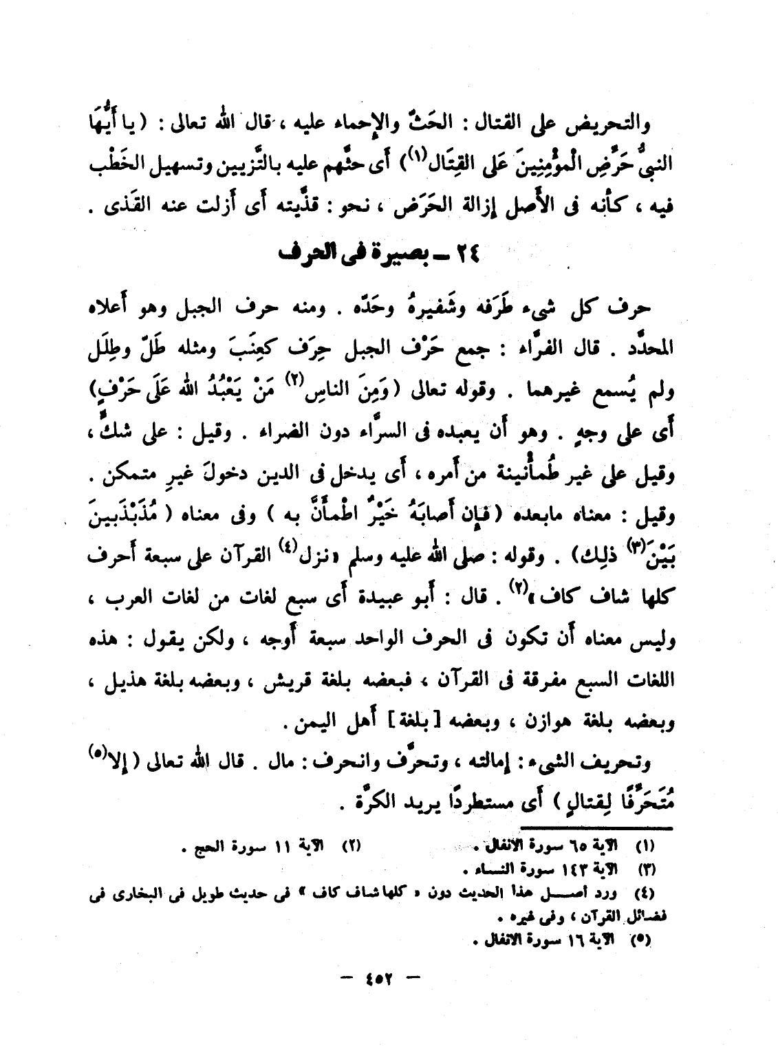 حرف كل شئ طَرَفه وشَفيرهُ وحَدّه. ومنه حرف الجبل وهو أَعلاه المحدَّد. قال الفرَّاء: جمع حَرْف الجبل حِرَف كعِنَبَ ومثله طَلّ وطِلَل ولم يُسمع غيرهما. وقوله تعالى {وَمِنَ الناس مَن يَعْبُدُ الله على حَرْفٍ} أَى على وجهٍ. وهو أَن يعبده فى السرَّاء دون الضراء. وقيل: على شكٍّ، وقيل على غير طُمأْنينة من أَمره، أَى يدخل فى الدين دخولَ غيرِ متمكن. وقيل: معناه ما بعده {فإِن أَصابَهُ خَيْرٌ اطْمأَنَّ به} وفى معناه {مُّذَبْذَبِينَ بَيْنَ ذلك} . وقوله: صلى الله عليه وسلم "نزل القرآن على سبعة أَحرف كلها شاف كاف". قال: أَبو عبيدة أَى سبع لغات من لغات العرب، وليس معناه أَن تكون فى الحرف الواحد سبعة أَوجه، ولكن يقول: هذه اللغات السبع مفرقة فى القرآن، فبعضه بلغة قريش، وبعضه بلغة هذيل، وبعض بلغة هوزان، وبعضه [بلغة] أَهل اليمن.