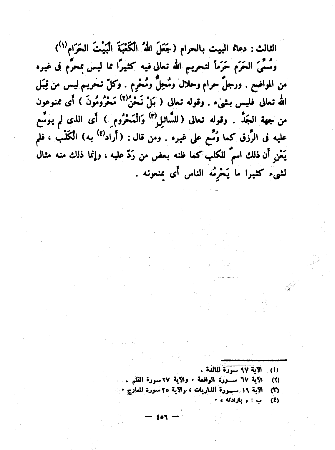 الثالث: دعاءُ البيت بالحرام {جَعَلَ الله الكعبة البيت الحرام} . وسُمِّىَ الحَرَم حَرَماً لتحريم الله تعالى فيه كثيراً مما ليس بمحرَّم فى غيره من المواضع. ورجلٌ حرام وحلال ومُحِلٌّ ومُحْرِم. وكلّ تحريم ليس من قِبَل الله تعالى فليس بشئ. وقوله تعالى {بَلْ نَحْنُ مَحْرُومُونَ} أَى ممنوعون من جهة الجَدِّ. وقوله تعالى {لَّلسَّآئِلِ والمحروم} أَى الذى لم يوسَّع عليه فى الرِّزق كما وُسِّع على غيره. ومن قال: (أَراد به) الْكَلْب، فلم يَعْنِ اَن ذلك اسمٌ للكلب كما ظنه بعض من رَدّ عليه، وإِنما ذلك منه مثال لشئ كثيرا ما يَحْرِمُه الناس أَى يمنعونه.