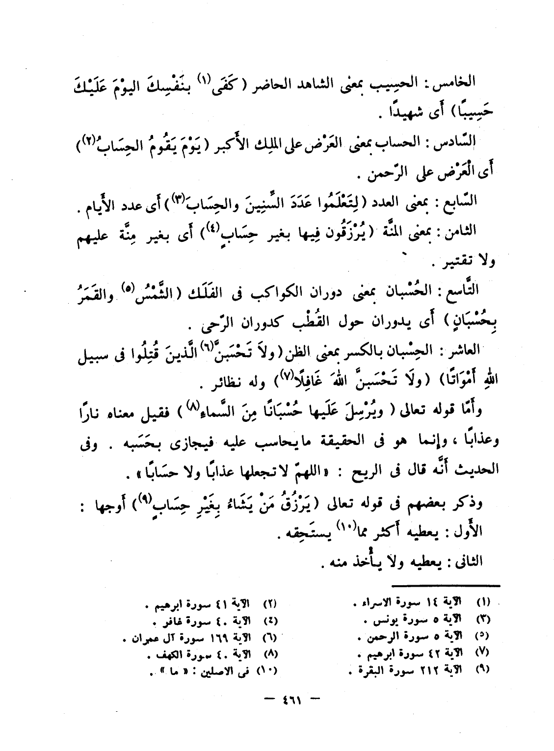 التَّاسع: الحُسْبان بمعنى دوران الكواكب فى الفَلَك {الشمس والقمر بِحُسْبَانٍ} أَى يدوران حول القُطْب كدوران الرّحى.