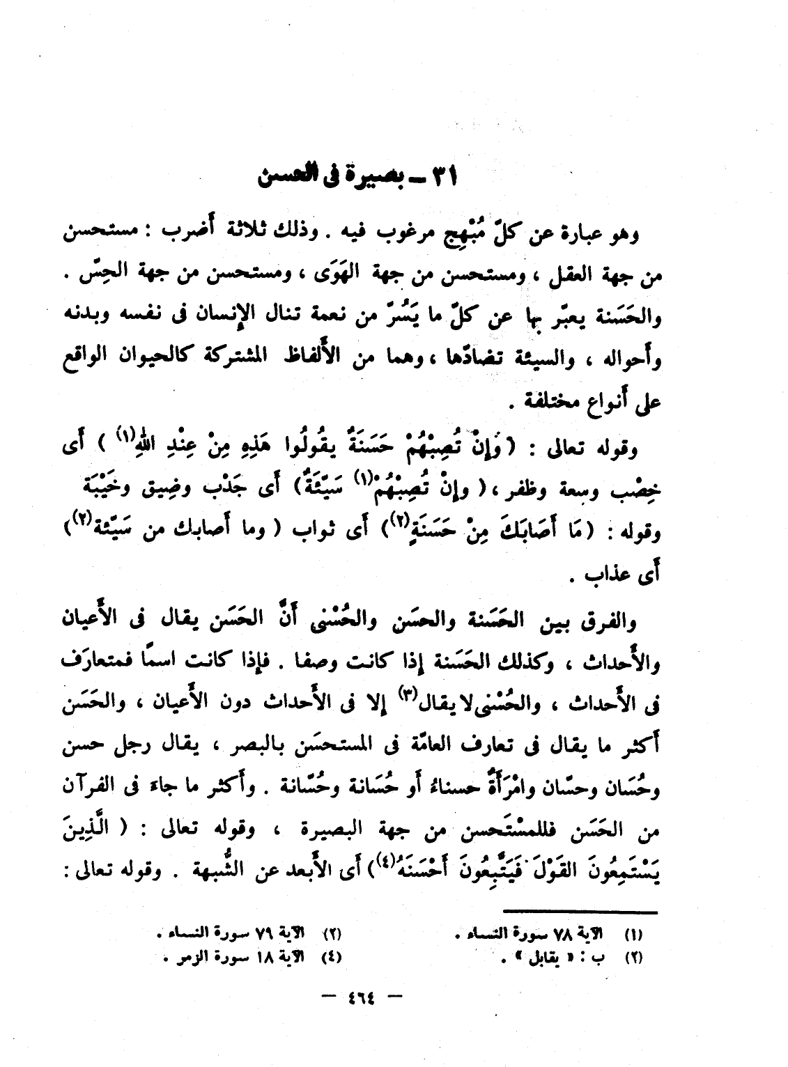 وهو عبارة عن كلّ مُبْهِج مرغوب فيه. وذلك ثلاثة أَضرب: مستحسن من جهة العقل، ومستحسن من جهة الهَوَى، ومستحسن من جهة الحِسّ. والحَسَنة يعبّر بها عن كلّ ما يَسُرّ من نعمة تنال الإِنسان فى نفسه وبدنه وأَحواله، والسيئة تضادّها، وهما من الأَلفاظ المشتركة كالحيوان الواقع على أَنواع مختلفة.