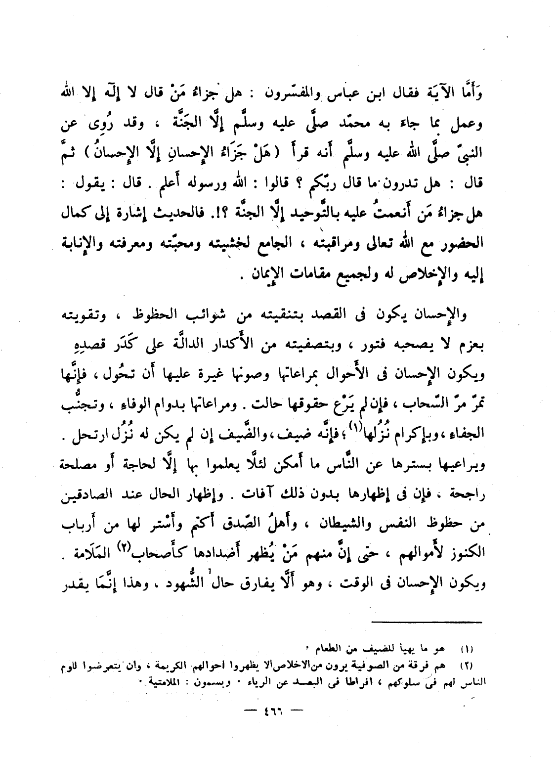 وَأَمّا الآيَة فقال ابن عباس والمفسّرون: هل جزاءُ مَنْ قال لا إِله إِلا الله وعمل بما جاءَ به محمّد صلَّى الله عليه وسلَّم إِلاَّ الجَنَّة، وقد رُوِى عن النبىّ صلَّى الله عليه وسلَّم أَنه قرأ {هَلْ جَزَاءُ الإِحسانِ إِلاَّ الإِحسانُ} ثمَّ قال: هل تدرون ما قال ربّكم؟ قالوا: الله ورسوله أَعلم. قال: يقول: هل جزاءُ مَن أَنعمتُ عليه بالتَّوحيد إِلاَّ الجنَّة؟!. فالحديث إِشارة إِلى كمال الحضور مع الله تعالى ومراقبته، الجامع لخشيته ومحبّته ومعرفته والإِنابة إِليه والإِخلاص له ولجمع مقامات الإِيمان.
