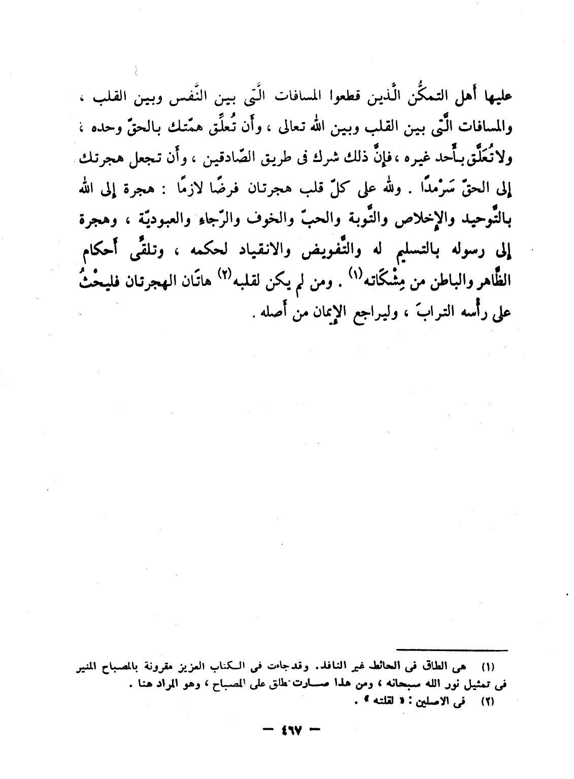 عليها أَهل التمكُّن الَّذين قطعوا المسافات الَّتى بين النَّفس وبين القلب، والمسافات الَّتى بين القلب وبين الله تعالى، وأَن تُعلِّق همّتك بالحقّ وحده، ولا تُعَلَّق بأَحد غيره، فإِنَّ ذلك شرك فى طريق الصّادقين، وأَن تجعل هجرتك إلى الحقّ سَرْمداً. ولله على كلّ قلب هجرتان فرضاً لازماً: هجرة إِلى الله بالتَّوحيد والإِخلاص والتَّوبة والحبّ والخوف والرّجاءِ والعبوديّة، وهجرة إِلى رسوله بالتسليم له والتَّفويض والانقياد لحكمه، وتلقِّى أَحكام الظَّاهر والباطن من مِشْكَاته. ومن لم يكن لقلبه هاتَان الهجرتان فليحْثُ على رأْسه الترابَ، وليراجع الإِيمان من أَصله.