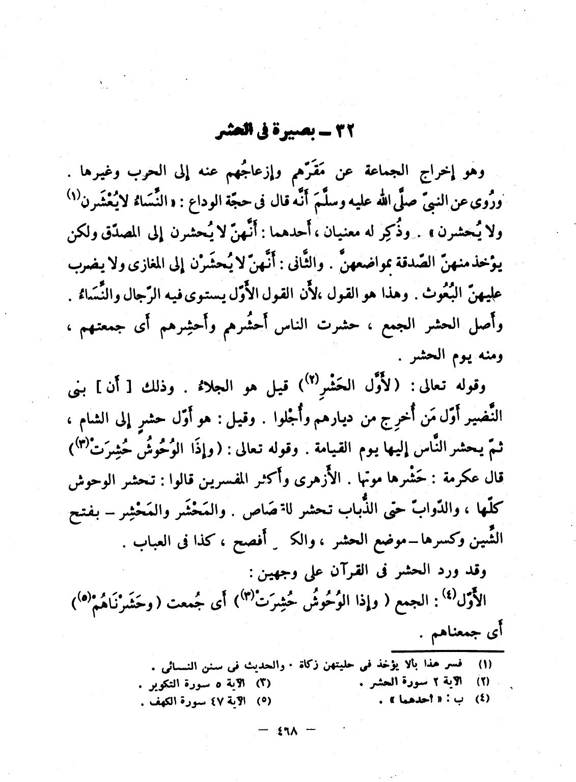 وهو إِخراج الجماعة عن مَقَرّهم وإِزعاجُهم عنه إِلى الحرب وغيرها. ورُوى عن النبىّ صلَّى الله عليه وسلَّمَ أَنَّه قال فى حجّة الوداع: "النِّسَاءُ لا يُعْشَرن ولا يُحشرن". وذُكِر له معنيان، أَحدهما: أَنَّهنّ لا يُحشرن إِلى المصدّق ولكن يؤخذ منهنّ الصّدقة بمواضعهنَّ. والثَّانى: أَنَّهنّ لا يُحشَرْن إِلى المغازى ولا يضرب عليهنّ البُعُوث. وهذا هو القول، لأَن القول الأَوّل يستوى فيه الرّجال والنِّسَاءُ. وأَصل الحشر الجمع، حشرت الناس أَحشُرهم وأَحشِرهم أَى جمعتهم، ومنه يوم الحشر.
